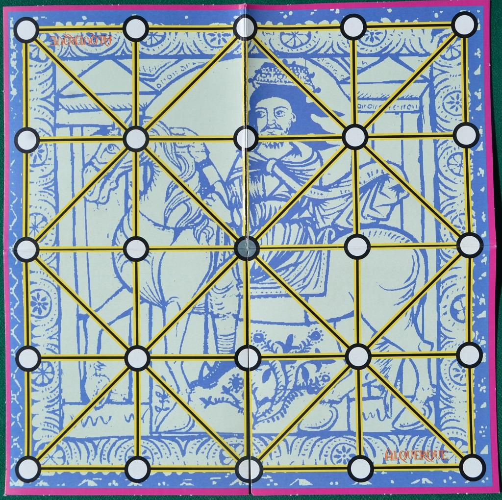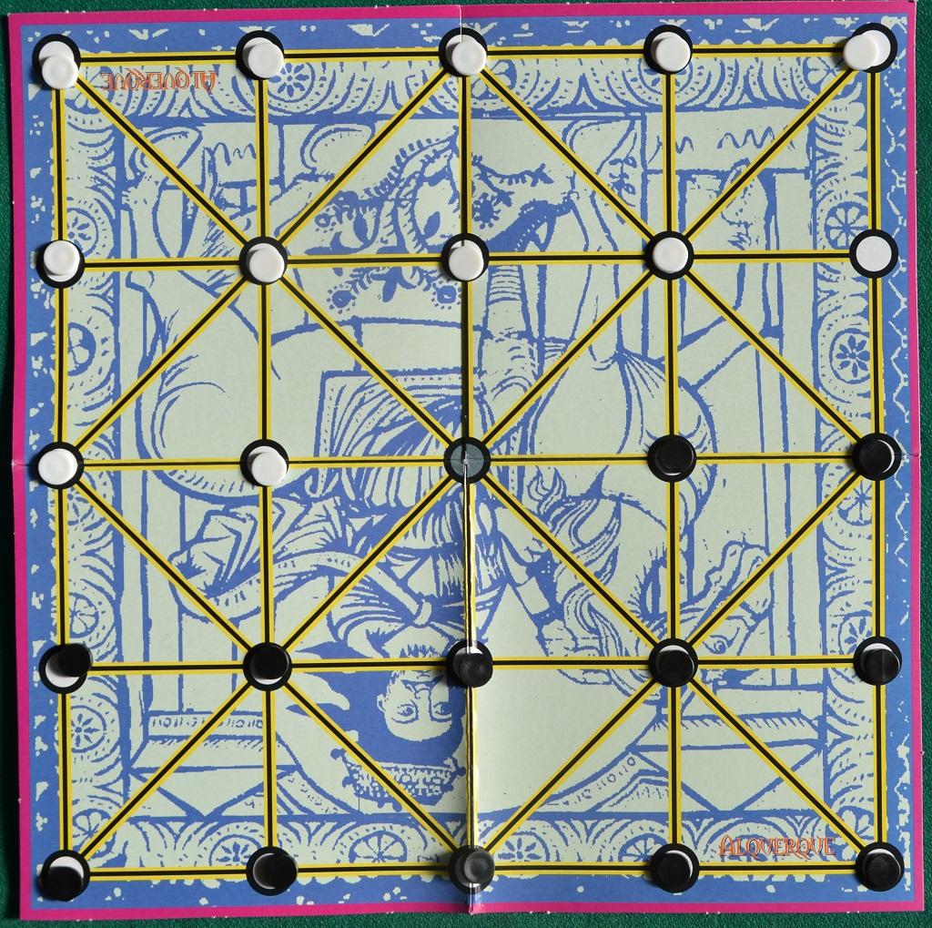 Guardando la griglia con tutte le pedine schierate sul tavoliere di ALQUERQUE si potrebbe pensare di avere davanti qualcosa di veloce e spensierato: invece questo gioco di origine araba (si chiamava originariamente El-Qirkat, ma a partire dal tredicesimo secolo si diffuse molto in Spagna, dove acquistò il suo nome attuale) necessita di una discreta applicazione mentale se non lo si vuole trasformare in una semplice sequenza di attacchi a testa bassa e solo per mangiare le pedine.