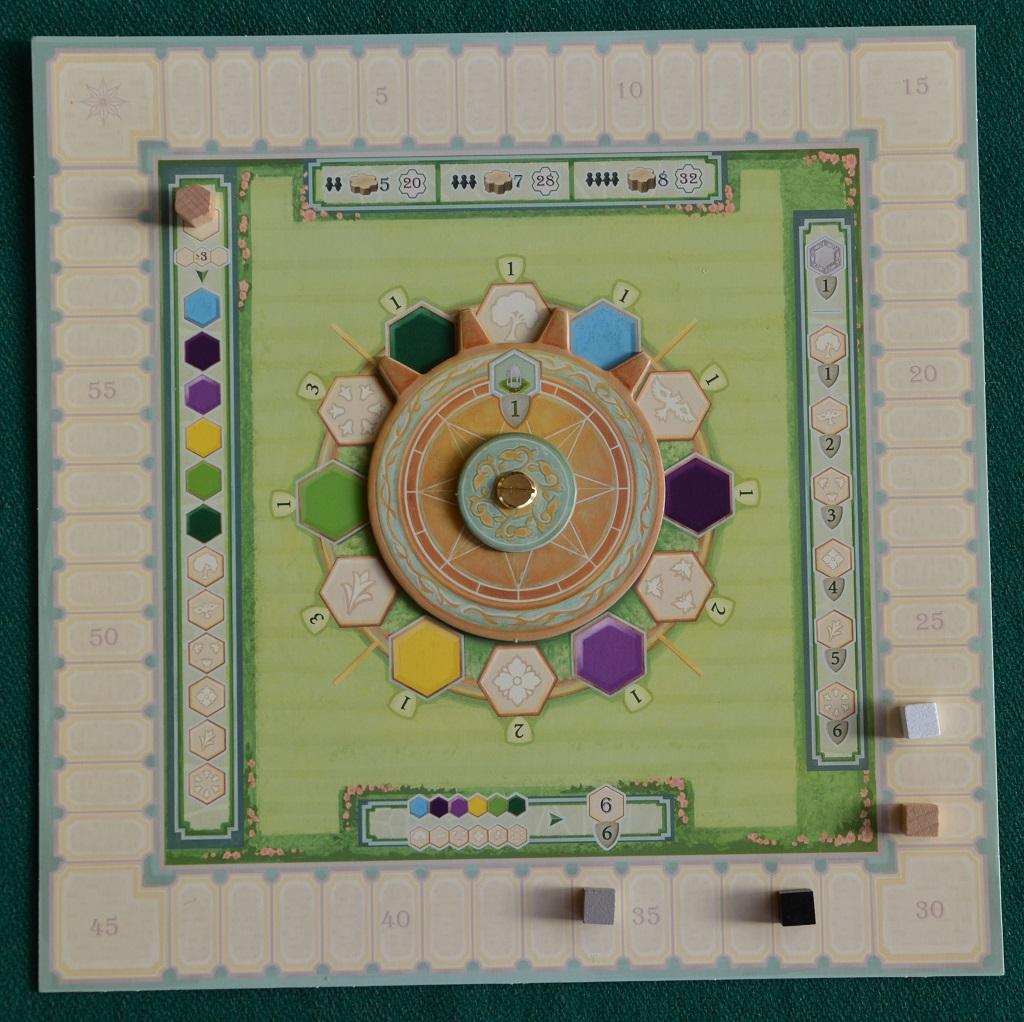 AZUL: QUEEN’S GARDEN è il quarto nato di questa interessante serie ideata da Michael Kiesling e, a mio avviso, è anche il più difficile, per cui, contrariamente ai fratelli, penso che sia riservato soprattutto ai giocatori più esperti. Il tabellone al centro del tavolo serve a selezionare i quattro turni del gioco ed i punti dei partecipanti: un disco girevole al centro indica i colori e/o i disegni che riceveranno un bonus in Punti Vittori (PV) per quel turno.