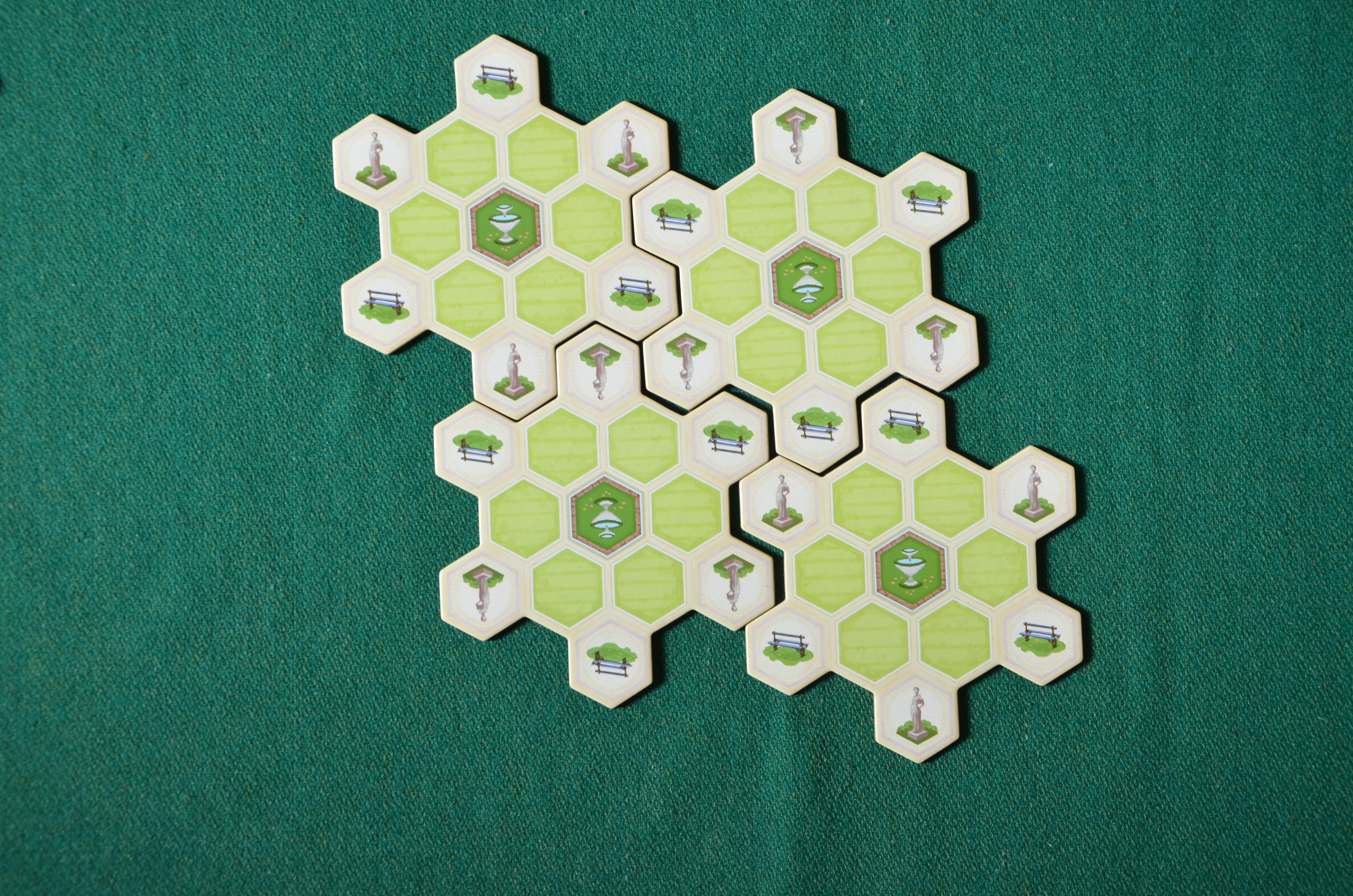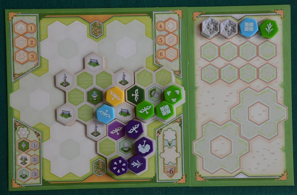 Poi ci sono 36 plancette esagonali “espansione giardino” stampate sui due lati: da una parte abbiamo 7 caselle libere mentre dall’altra vediamo un “padiglione” al centro ed un disegno su uno dei sei esagoni che lo circondano. Si formano quattro pile di plancette “espansione” (una per turno) e, contrariamente a quanto succedeva nei giochi precedenti, qui si “carica” con 7 piastrelle la prima delle plancette, in cima alla prima pila: quando almeno una tessera viene prelevata la plancetta si sposta sul tavolo, si “carica” la seguente, continuando in questo modo fino al termine del turno, che avviene quando tutti i giocatori decidono di passare.