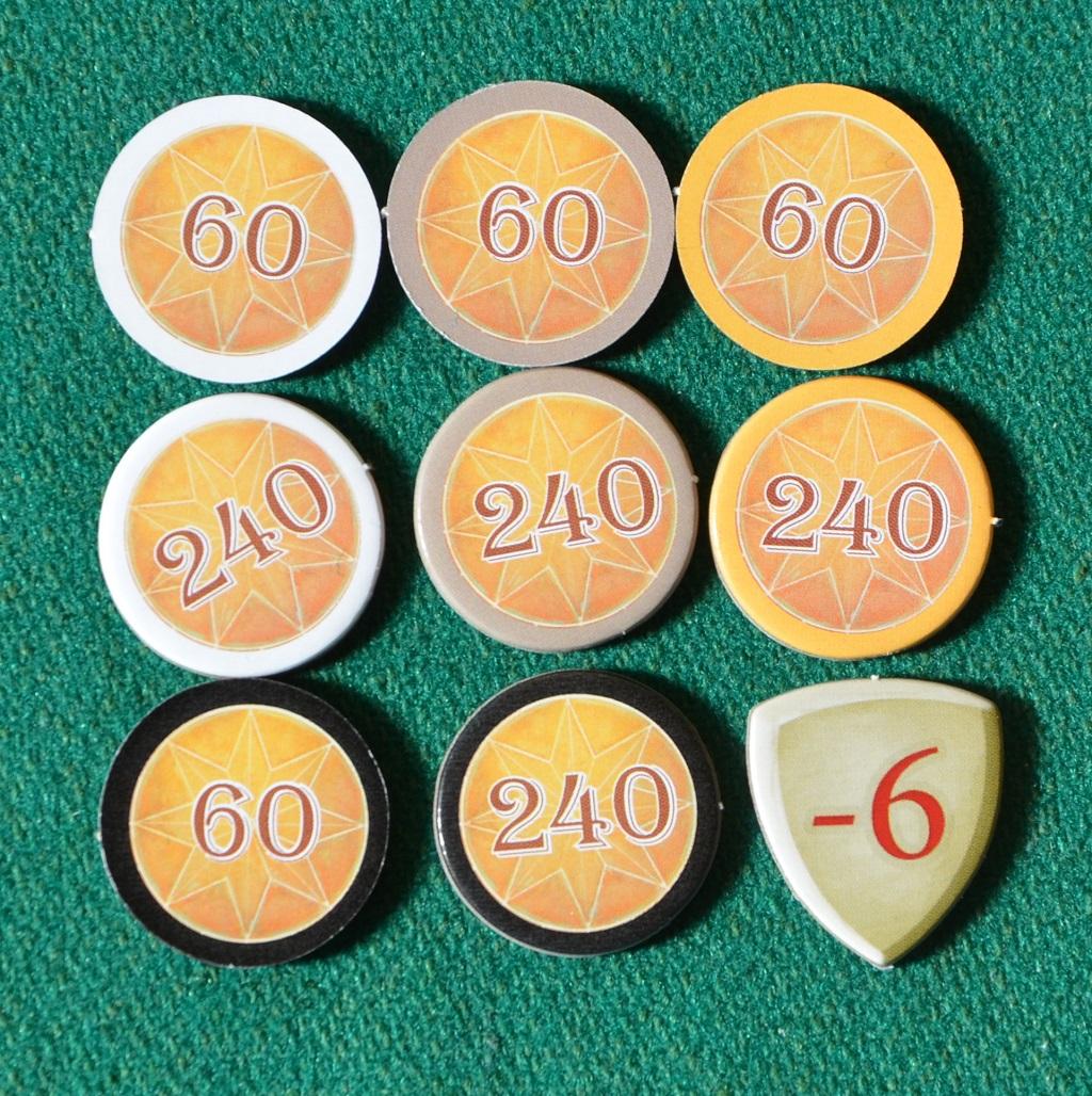 Le 108 tessere (come sempre di plastica dura) sono a forma esagonale in 6 colori diversi: ognuna di esse ha un disegno stampato su entrambe le facce, il quale indica anche il numero di tessere da pagare per poterla piazzare sulla propria plancia personale. Basta una sola tessera per piazzare un “albero”, ce ne vogliono due per un “uccello”, ecc. fino alle 6 delle “campanelle”. Al centro della plancia personale si posiziona una plancetta “Fontana” con sei caselle esagonali libere, da utilizzare per piazzare le tessere di plastica.