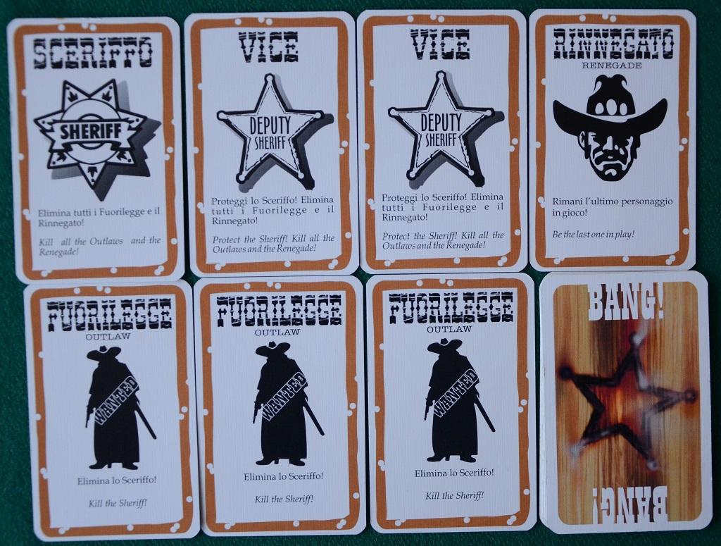 Infine si mescola il mazzo di carte e se ne distribuiscono a ciascun personaggio tante quanti sono i suoi PV. Da notare che ogni personaggio ha una caratteristica ben specifica ed ogni “ruolo” ha una missione da compiere per vincere. Prima di iniziare il gioco lo Sceriffo mostra pubblicamente la sua carta ed assumerà anche il ruolo di primo giocatore.