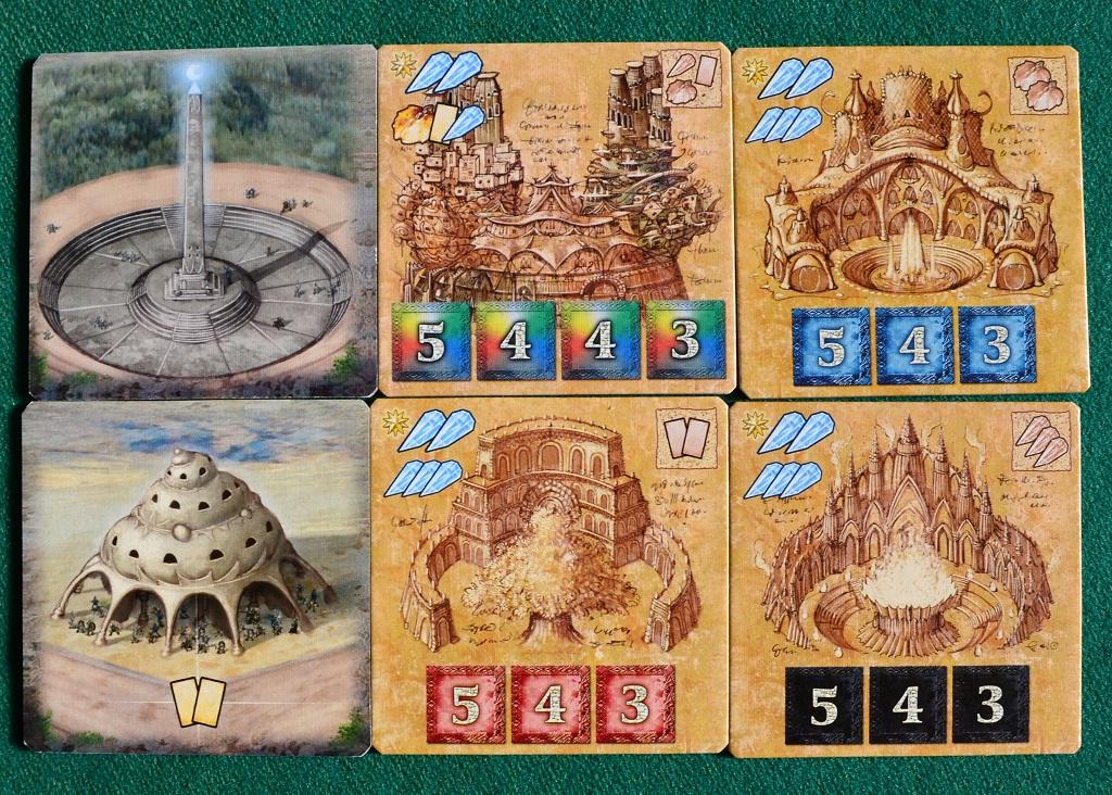 Ogni tessera è stampata su entrambi lati: quello visibile al setup indica che l’edificio disegnato è in costruzione e mostra da 1 a 4 caselle numerate e colorate: sul retro si vede l’edificio completato con un bonus (Cristalli o favori del Drago). I giocatori, al loro turno, possono spostare il loro “cavaliere” di 1-2 tessere (muovendosi sempre ortogonalmente) con l’opportunità di riempire una o più caselle dell’edificio raggiunto: per farlo devono “pagare” delle carte (del colore stampato sulla casella) che totalizzino un valore pari al numero indicato. Uno dei segnalini del loro colore verrà posto sulla casella.