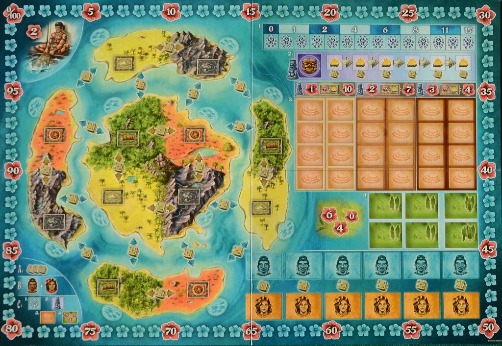 L’isola di BORA BORA fa parte di un gruppo di isolotti e/o scogli a nord ovest di Tahiti a cui è stato dato il nome di “Arcipelago della Società”: ma è anche un titolo per giocatori abbastanza… scafati. Il tabellone ci mostra l’isola principale al centro (divisa in quattro aree diverse: spiaggia, pianura, foresta e montagna) e quattro isolotti che la circondano, ognuno diviso in due aree. Ai giocatori viene data una plancia sulla quale sono indicate tutte le azioni possibili ed un numero di capanne che potranno essere installate e popolate di uomini e donne: tutti ricevono anche tre dadi del colore delle casette. Di fianco al tabellone vengono infine piazzate le tessere necessarie: Azioni, Uomini, Donne, Dei, Offerte, Gioielli, ecc.