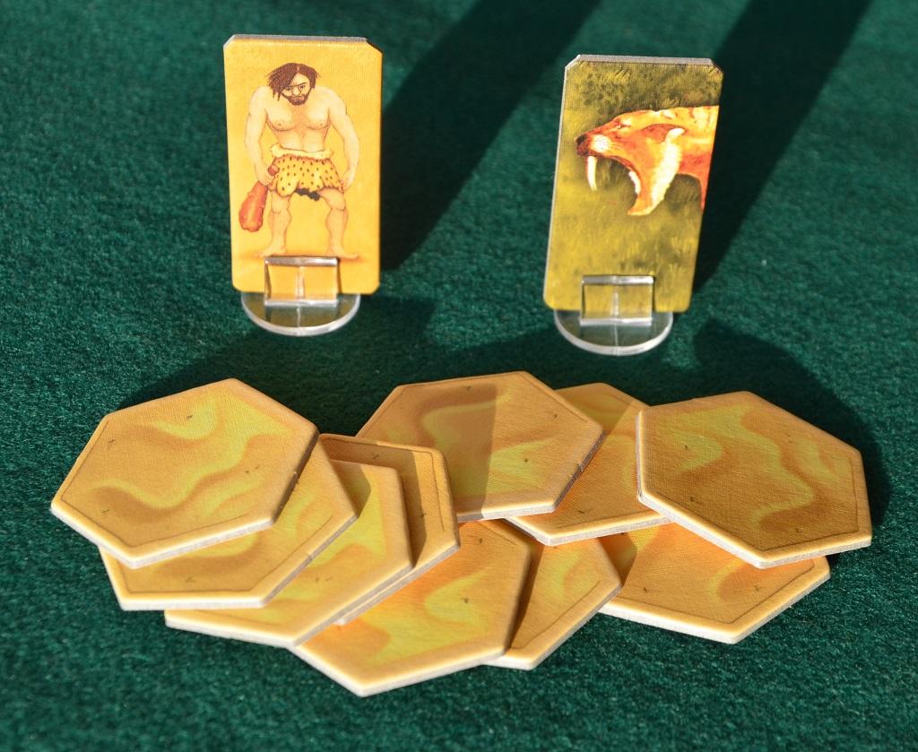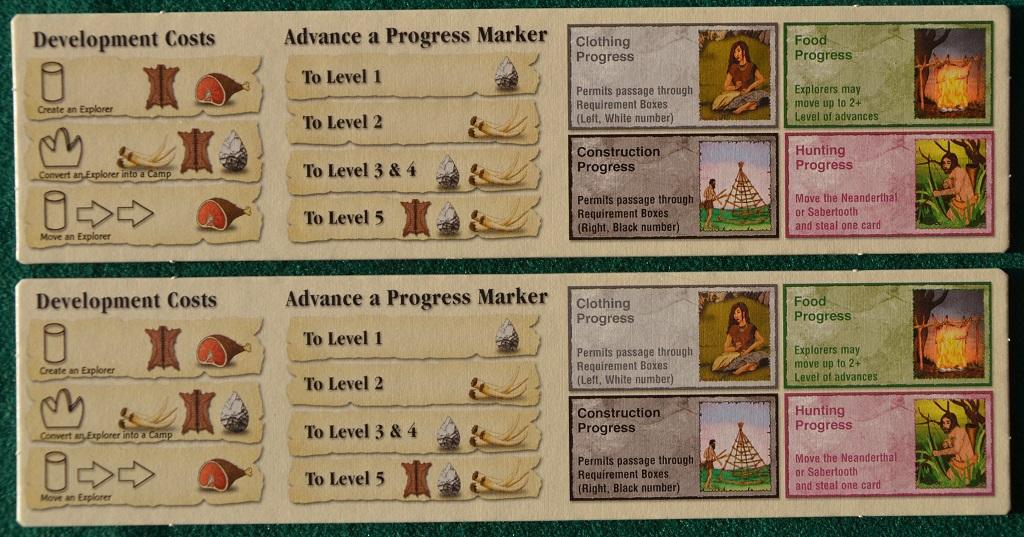 La maggior parte delle caselle di terreno ha un numero stampato al suo interno (da 2 a 12) che servirà per l’assegnazione delle risorse. Attorno al tabellone sono stampate quattro serie di sei caselle “Progresso”: cibo, caccia, costruzioni e abbigliamento e si riferiscono all’avanzamento “tecnologico” dell’uomo preistorico nei quattro indici.