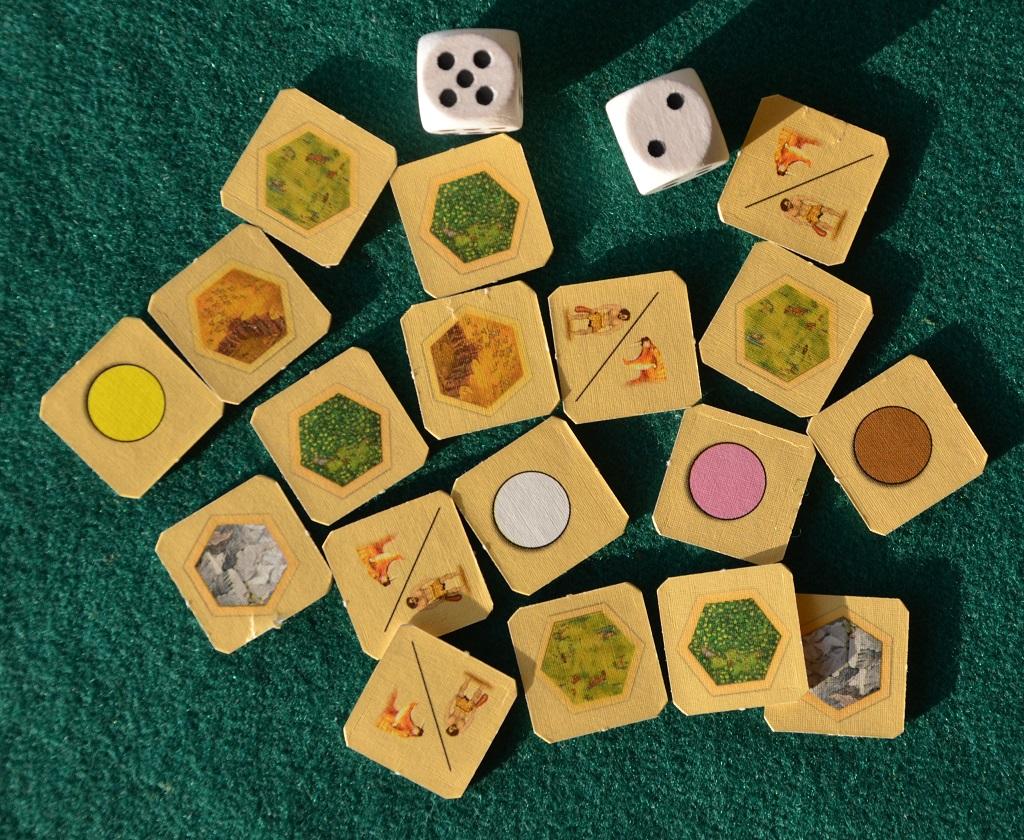 Gli esagoni sono un po’ più piccoli delle usuali dimensioni e raffigurano i soliti terreni: pianure, foreste, colline e montagne. La prima macro-differenza rispetto a CATAN è che sulla mappa sono già stampati dei cerchietti in ogni vertice degli esagoni, alcuni dei quali sono colorati di bianco, giallo, rosa e marrone: su questi cerchietti vanno posati gli appositi gettoni “tribù” (otto per ogni colore).