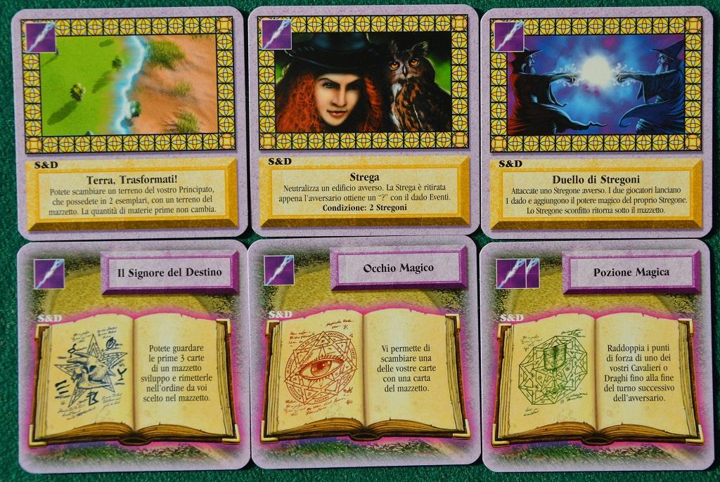 carte "terreno" (verdi) che permettono di aggiungere al proprio regno edifici, porti, cavalieri, forti, cave, pascoli, ecc. con un costo abbastanza limitato;