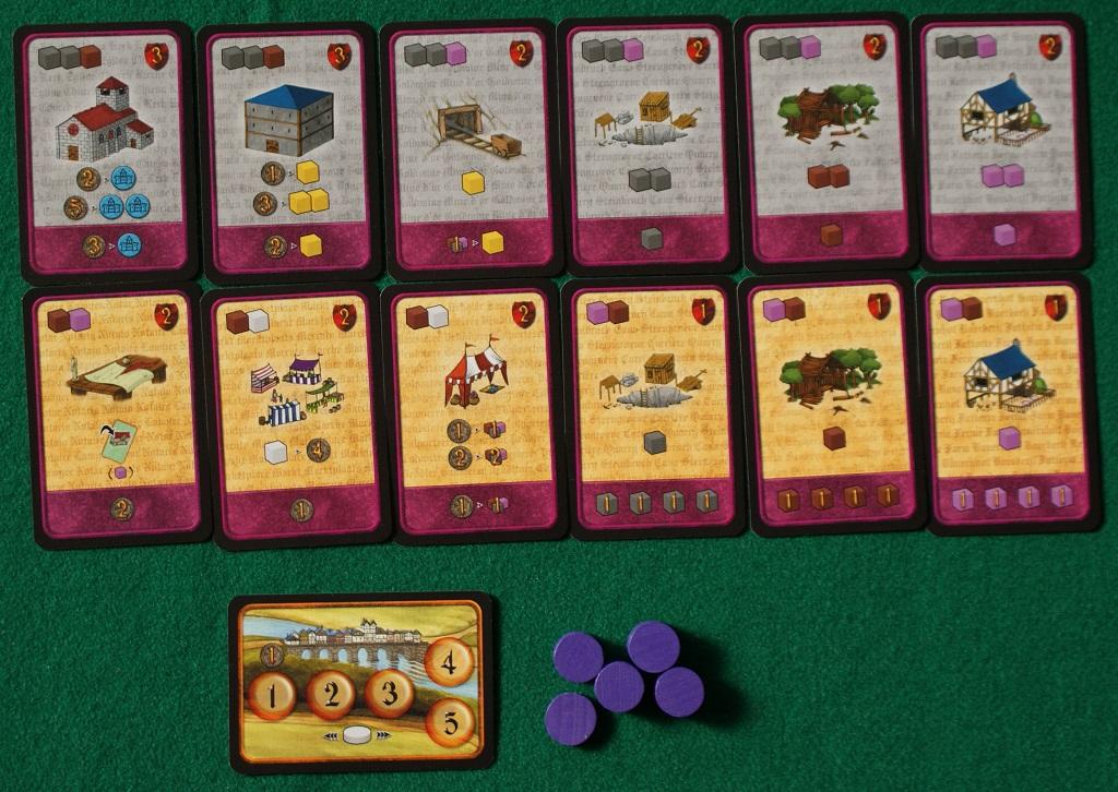 Ad inizio partita viene messe sul tavolo un certo numero di carte di base (rosa) a seconda dei partecipanti, poi si schierano a parte quelle con gli edifici di “Prestigio”: ogni giocatore riceve 4 lavoratori, un mazzetto di carte dello stesso colore dei segnalini, 4 monete e 4 cubetti “risorsa” (2 cibo e 2 legno).