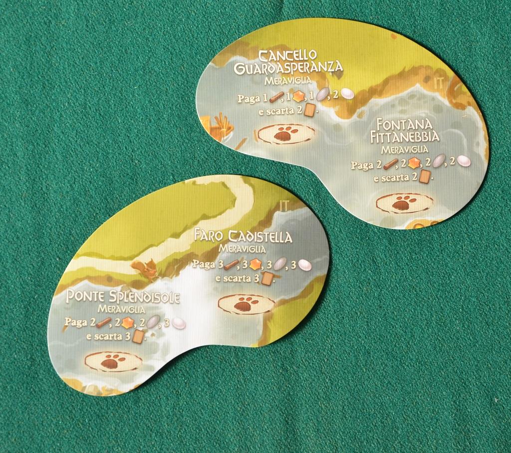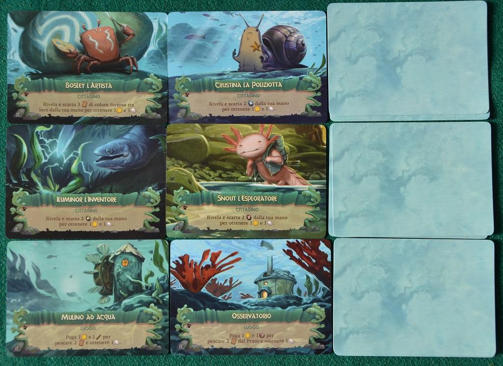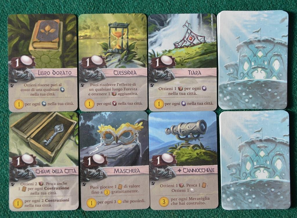Altre infine si combinano fra loro: la gru, per esempio, può essere scartata per dare uno sconto di tre risorse quando si vuole costruire un nuovo edificio, il tribunale permette di prendere una risorsa ogni volta che viene aggiunta una costruzione al villaggio, il bardo fa scartare fino a 5 carte dalla mano in cambio di 1 PV per ognuna, l’emporio regala 1 bacca, ma se ci sono fattorie nel villaggio aggiunge una bacca extra per ciascuna di esse, ecc.
