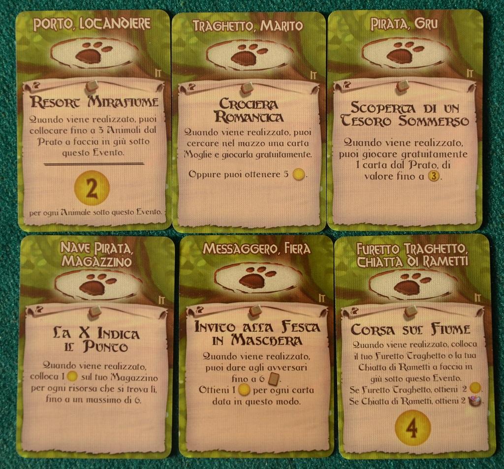 Infine ci sono i bonus degli eventi: per ottenere una tessera “base” (che assegna 3 PV a fine partita) basta avere nel proprio villaggio un certo numero di carte del tipo indicato sulla tessera. Per ottenere le carte “evento speciale” invece occorre avere nel villaggio i due personaggi indicati sulla carta e pagare inoltre il numero di risorse indicato: questi eventi (se ne usano quattro in ogni partita, da prendere a caso ad inizio partita da un mazzo di sedici) assegnano da “1” a “9” PV e/o permettono azioni specifiche (attivare le carte produzione, ricevere PV in cambio di risorse, eliminare carte dal villaggio (per fare spazio a carte più forti), ecc.