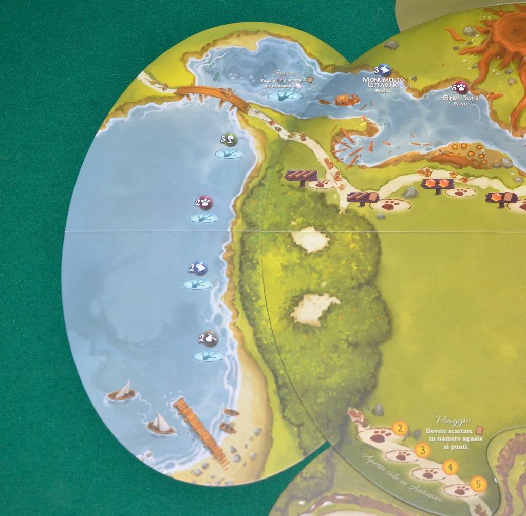 Gli animaletti si posano su uno dei luoghi della mappa indicati da un cerchietto (alcune sono mono-uso, altre possono accogliere più pezzi) ed il giocatore raccoglie le risorse indicate (o acquisisce gli eventi se ha i personaggi e le risorse giuste). Le carte invece vengono messe in una griglia 3x5 (il villaggio) e possono essere giocate pagando le risorse richieste oppure possedendo l’edificio corrispondente (tribunale per il giudice, fattoria per il contadino, ecc.). Spesso una carta va in “combinazione” con altre (o si elimina per ottenere un vantaggio) e può quindi dare il via ad una catena di avvenimenti.