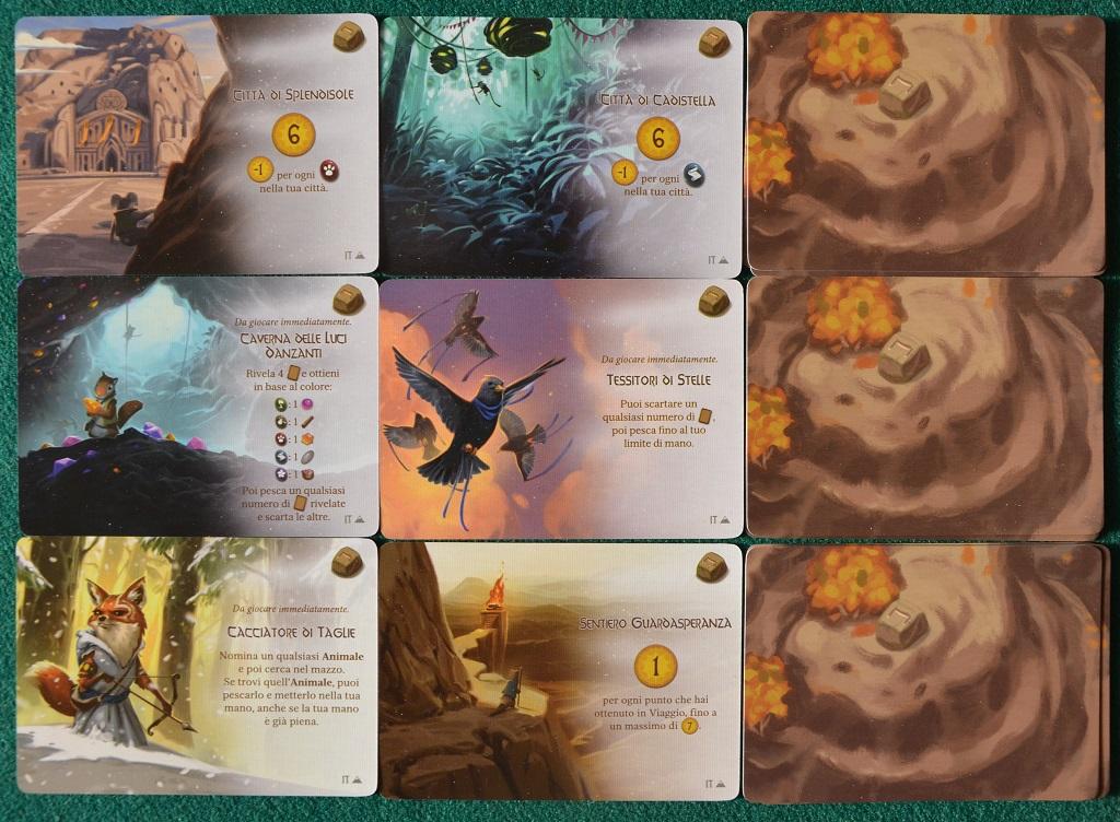 Altre infine si combinano fra loro: la gru, per esempio, può essere scartata per dare uno sconto di tre risorse quando si vuole costruire un nuovo edificio, il tribunale permette di prendere una risorsa ogni volta che viene aggiunta una costruzione al villaggio, il bardo fa scartare fino a 5 carte dalla mano in cambio di 1 PV per ognuna, l’emporio regala 1 bacca, ma se ci sono fattorie nel villaggio aggiunge una bacca extra per ciascuna di esse, ecc.