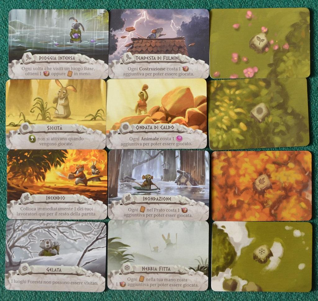 In primavera si ottiene un animaletto extra e tutte le carte produzione vengono attivate immediatamente; in estate si aggiunge un altro animaletto e si prendono due carte dal prato; in autunno si prendono gli ultimi due animaletti e di nuovo si attivano tutte le carte produzione.