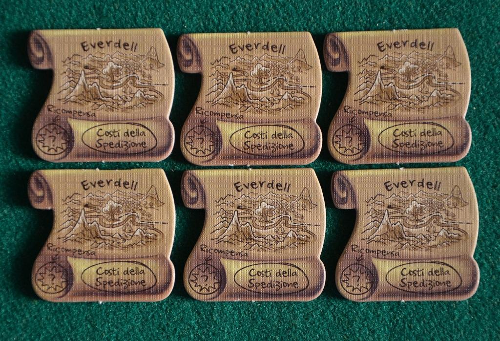 EVERDELL SPIRECRES è sicuramente l’espansione più “corposa” fra quelle uscite fino ad oggi, con un grande tabellone che rappresenta le “Montagne” a Sud di Everdell ed un libretto di istruzioni più consistente dei precedenti: all’interno della scatola troviamo inoltre quattro nuovi tipi di animaletti (le Volpi, arancione, i Gufi, grigio chiaro, le Lucertole, verde chiaro, e le talpe, grigio scuro) con i relativi Ambasciatori (per usarli nell’espansione Pearlbrook), ma tutti gli altri elementi sono una novità, dalla quindicina di “Conigli” (uno per colore) che rappresentano i “Viaggiatori” alle 32 carte “Scoperta” e 12 carte “Clima”, oltre a 30 tessere “Mappa”, una manciata di gettoni PV e 6 “Selle” di plastica marrone.