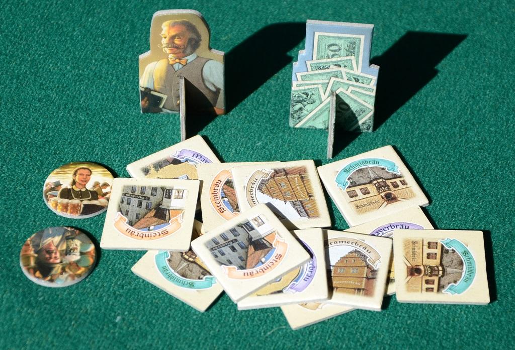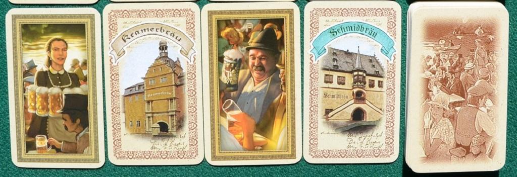 La scatola include anche un mazzo di carte dove sono raffigurate (6 volte ciascuna) le birrerie e le fabbriche del tabellone, con l’aggiunta di alcune carte “cameriera” e “ubriacone”. Ogni giocatore ha a disposizione 6 pedine “padrone” (che rappresentano gli osti o i direttori delle fabbriche) e 18 cubetti (da utilizzare per indicare la partecipazione dei giocatori alle diverse imprese: birrerie e/o fabbriche).