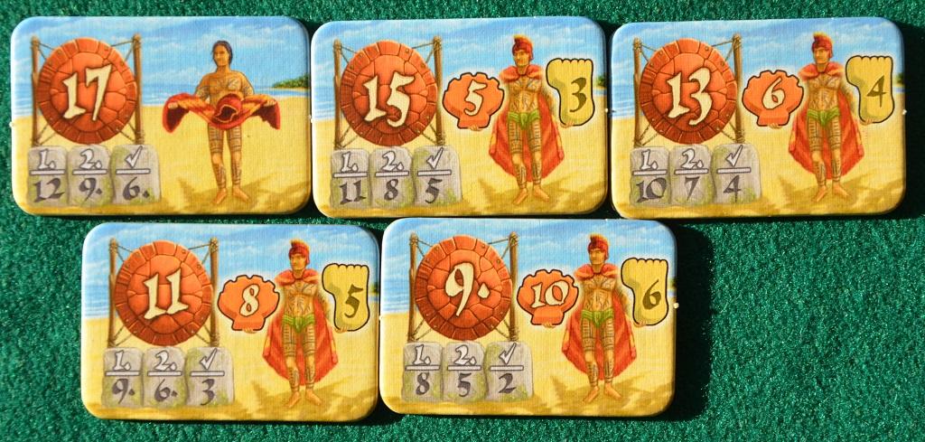 Per riuscire basta ... risparmiare conchiglie e piedi ed accumularne un buon numero per poter battere la concorrenza. Le tessere disponibili sono di vario tipo, ma potremmo dividerle in categorie: