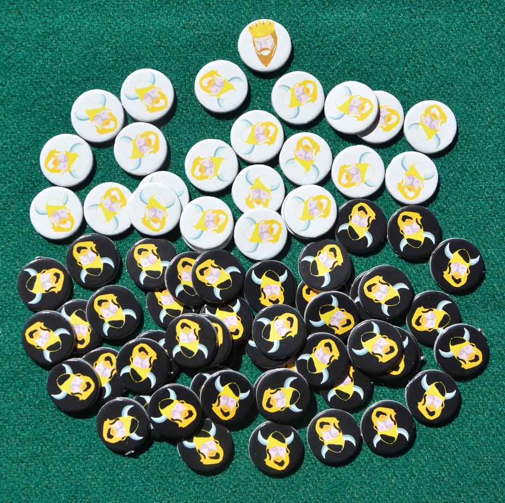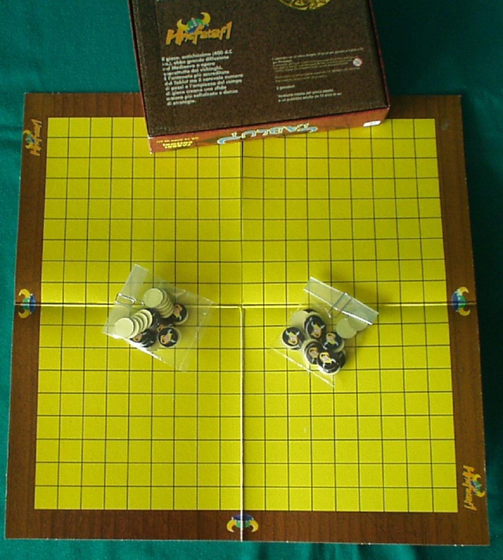 HNEFATAFL è un “antenato” del Tablut e si gioca su una scacchiera che ha un reticolo di 19x19 righe e colonne: ci sono 24 pedine bianche (più una pedina Re) e 48 nere. Esse verranno posizionate e mosse solo sugli “incroci” del reticolo. A turno è possibile spostare una sola pedina di tanti incroci quanti si vuole purché il percorso non sia interrotto da un’altra pedina o dalle caselle del bordo esterno.