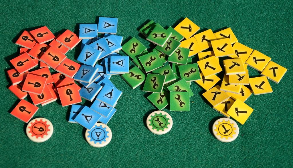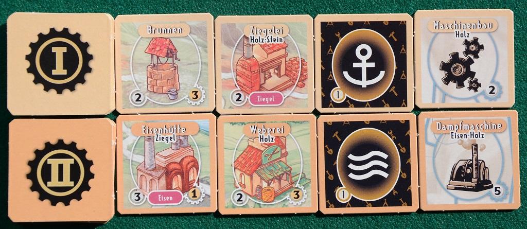 Ci sono poi cinque pile di 12 tessere, divise per Era, sulle quali sono stampati gli stessi disegni del tabellone (fabbriche, tecnologia, materie prime) oltre ad alcuni simboli che funzioneranno da moltiplicatori al momento del conteggio finale. I giocatori ricevono 4 “Talleri” (la valuta utilizzata), un marcatore per segnare i punti guadagnati ed una ventina di tessere “Proprietà” con cui evidenzieranno gli acquisti.