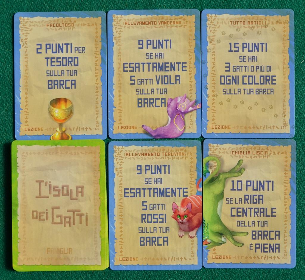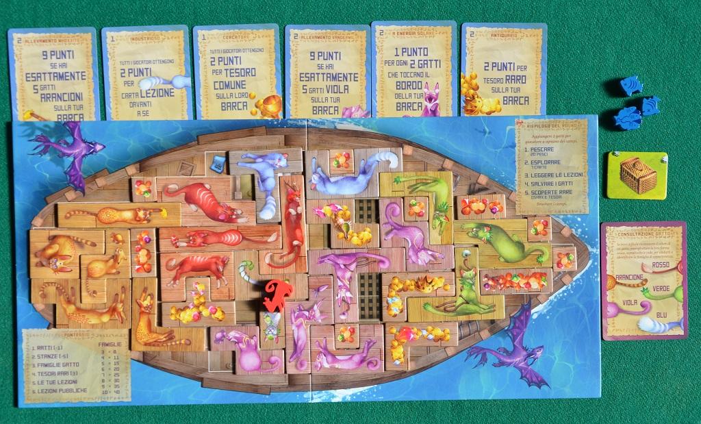 Quest’ultima ha diverse “stanze” e tutta la superficie è coperta da una griglia di quadretti da “coprire” con i gatti ed i tesori: a fine partita ogni “ratto” ancora visibile sulla nave da una penalità di -1 PV e ogni stanza non coperta totalmente costa -5 PV. Poi ognuno somma i PV guadagnati in base alle famiglie di gatti che ha piazzato sulla nave e aggiunge i punti delle carte “lezione” realizzate. Chi ottiene il totale più alto vince.