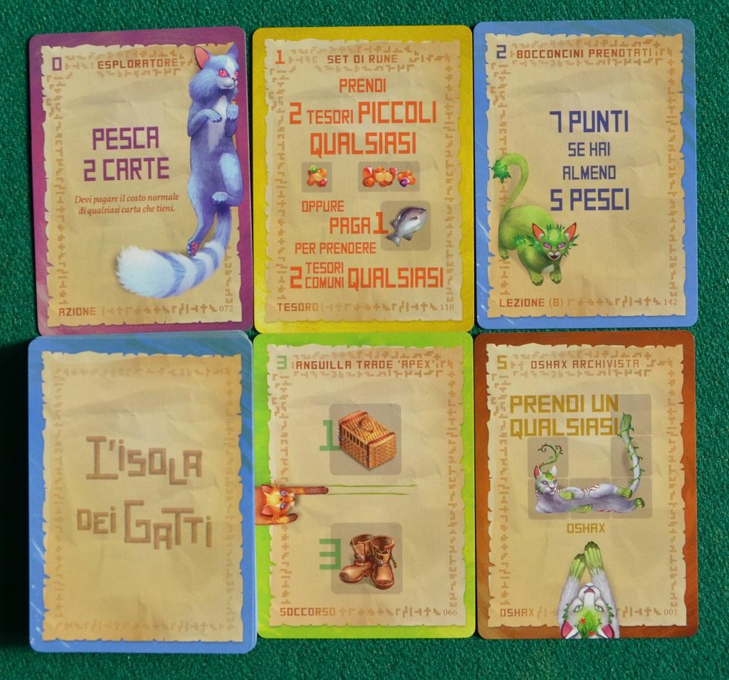 È chiaro fin da subito che il “draft” iniziale di ISLE OF CATS serve come base per l’intero round: dovendo scegliere solo due carte alla volta è bene mettere subito da parte quelle più importanti per voi (per esempio le carte “soccorso” o “lezione” particolarmente interessanti) sperando poi di riuscire a procurarsene in seguito altre 3-4 interessanti per completare la propria mano.
