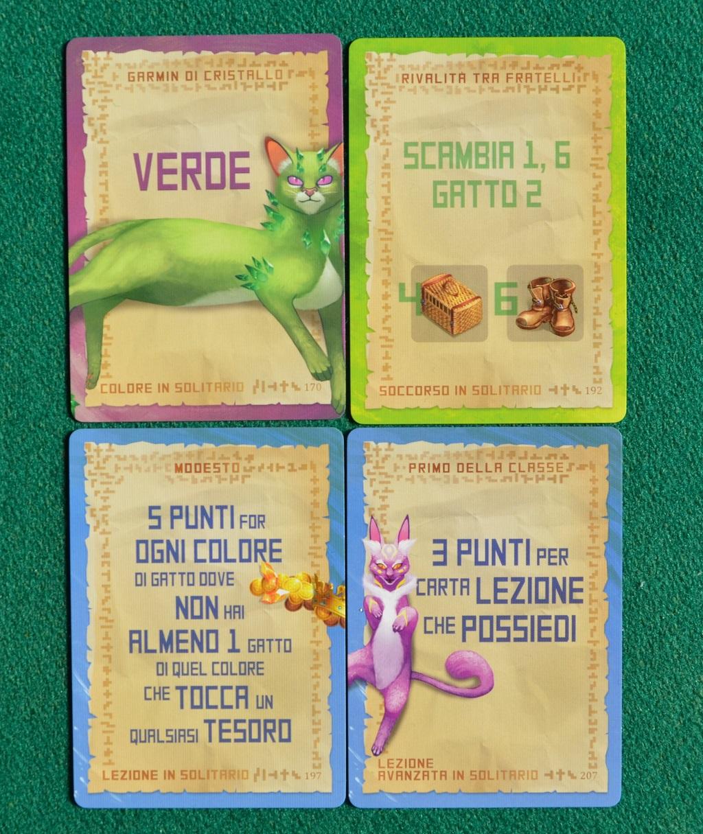 Fare famiglie di gatti dello stesso colore fa incassare parecchi punti, a partire da 4-6 tessere adiacenti (11-15-20 PV ciascuna): quindi se durante la partita riuscite ad avere fin dall’inizio un paio di famiglie di colore diverso spingete molto per ampliarle ancora di più: 5 famiglie da 3 tessere valgono infatti 40 PV, esattamente come 2 sole famiglie da 6 tessere.