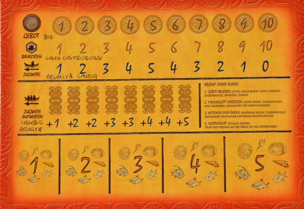 L’ordine di turno così formato (da chi ha fatto l’offerta più alla più bassa) costituisce anche l’ordine con cui verranno scelte ed eseguite le azioni: costruire (pagando le capanne con delle conchiglie), pescare (portando le canoe adiacenti a capanne di “adorazione” e lanciando un dado speciale per ognuna di queste ultime), vendere il pesce (con le canoe accanto alle capanne degli avversari e posando fino a tre pesci in ognuna di esse), aumentando la velocità della voga, ecc.