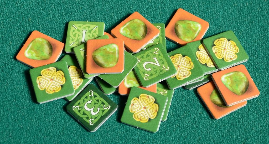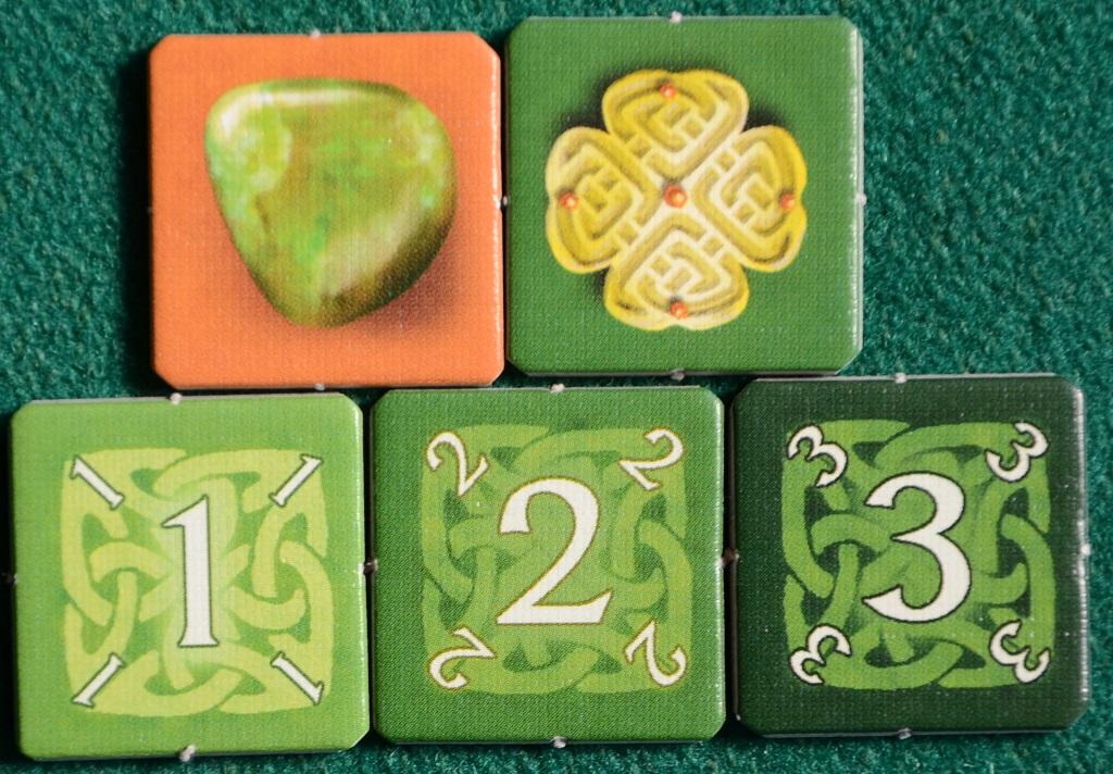 In KELTIS ogni giocatore prende 4 segnalini "quadrifoglio" piccoli e quello doppio del suo colore e li piazza nella grande pietra al centro in basso del tabellone (l'ultimo segnalino serve solo per contare i punti).