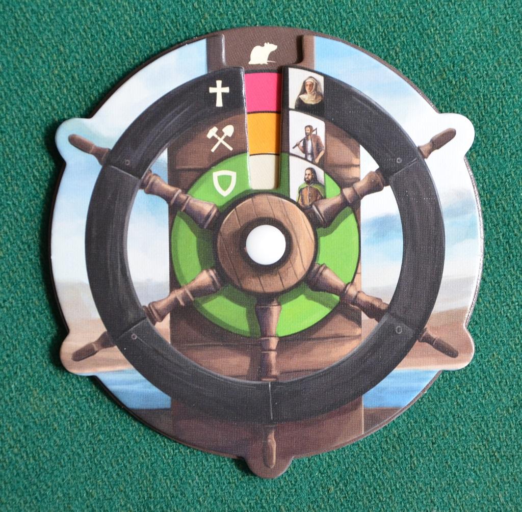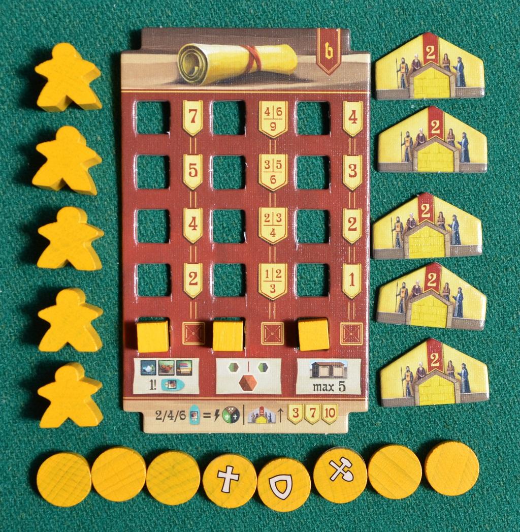 Sul tabellone ci sono però anche altri due tracciati: il “Registro Cittadino” e “l’Ecclesiastico”: anch’essi danno benefici se si raggiungono certe caselle (meeples extra, spostamento dei “Supervisori”, risorse, ecc.). I Supervisori sono appositi dischetti che si muovono all’interno delle tre sezioni della plancia personale e permettono di attivare le azioni degli abitanti già posizionati in quei settori.
