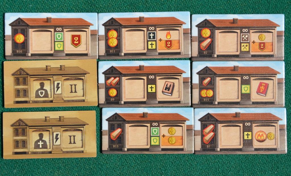 È molto importante, all’inizio della partita, cercare di raccogliere un minimo di “Abitanti” da piazzare sulla plancia nelle caselle più interessanti (cioè quelle che ci permettono azioni supplementari quando spostiamo i “Supervisori”). Fra le “urgenze” non dobbiamo dimenticare di acquistare qualche capanno (gli abitanti in quarantena potranno allora essere usati per due turni come “lavoratori” extra), alcune botteghe (che assegnano bonus ed azioni speciali se vengono utilizzate da un Abitante) ed i carretti, i quali saranno indispensabili per riportare la gente guarita nei Rioni cittadini senza più peste.