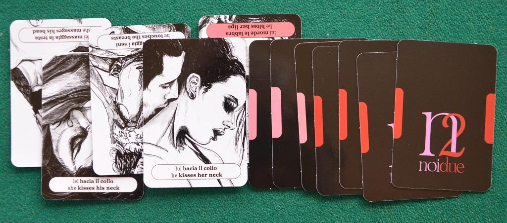 All’interno della scatola troviamo un mazzo di carte divise in vari tipi: 11 “bianche” (coccole e sfioramenti sopra i vestiti), 10 “rosa” (sempre vestiti, ma si comincia ad osare sotto di essi) e 17 “rosse” (e qui non ci sono limiti specifici). Le altre sono “complementari”, nel senso che le 6 “Tempo” servono a stabilire la durata di ogni azione (1-2-3 minuti), le 11 “Azione” servono a pigmentare il gioco, le 12 “Noi Tre” danno la possibilità di aggiungere un terzo “giocatore”, mentre le 2 “Noi Quattro” sono solo per due coppie molto affiatate.