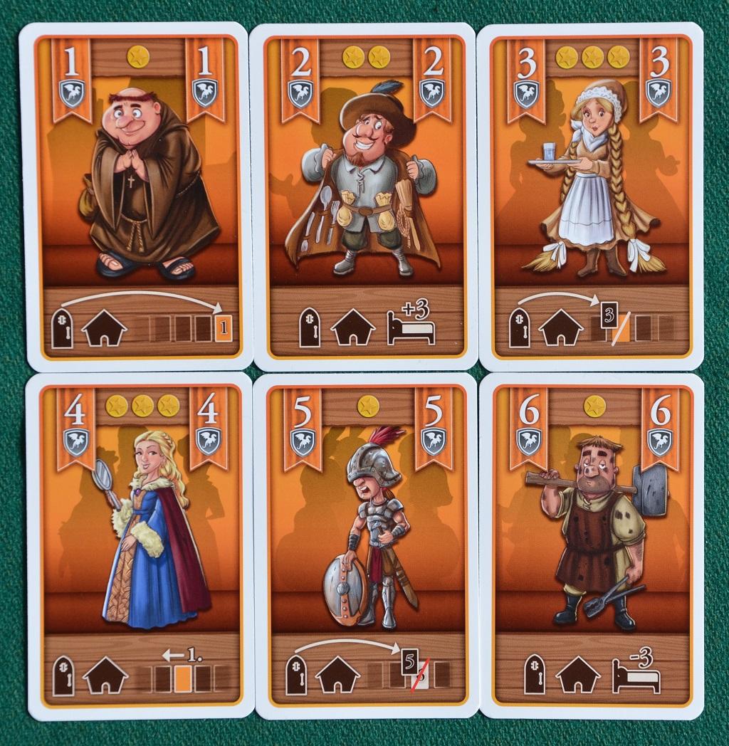 Ogni giocatore riceve un set di 24 carte “personaggio” di valore variabile da “1” a “6”, ognuno dei quali ha una “azione speciale” stampata in basso ed un valore in PV (monete): il mazzetto viene mescolato accuratamente ed ognuno prende le prime 9 carte poi, a giro, se ne posano una dopo l’altra 5 sul tavolo (coperte), mettendole a destra di un hotel a scelta (per prenotare 1-6 camere) oppure a sinistra (max due per hotel) per utilizzare l’azione speciale del personaggio.