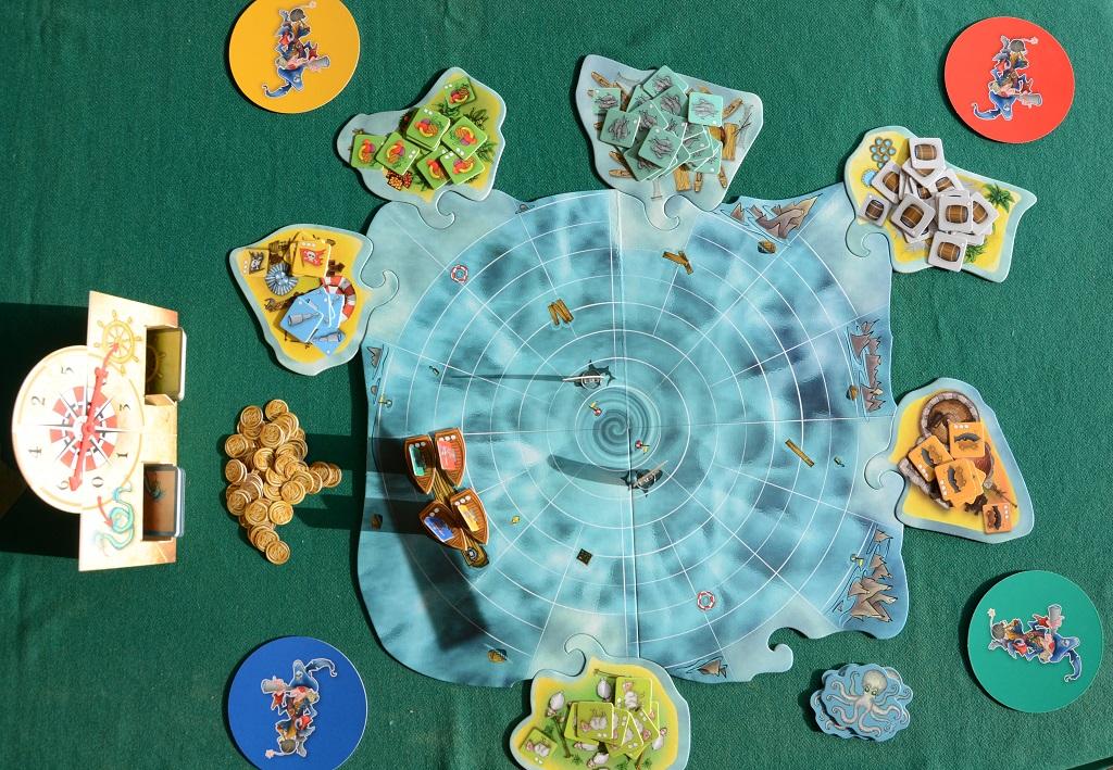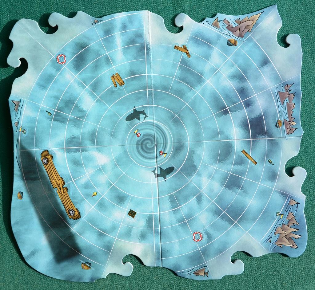 Il tabellone è molto frastagliato e sul suo bordo sono stati ricavati dei “denti” sui quali dovranno essere incastrate sei plance “Isola”, ognuna “specializzata in una merce: pesce, barilotto, frutta, pecore, cannone e cannocchiale. Sempre sul tabellone è sovrastampata una griglia di caselle a cerchi concentrici, da utilizzare per il movimento: in due caselle vicino al centro si mettono due “squali” da utilizzare per ostacolare gli avversari.