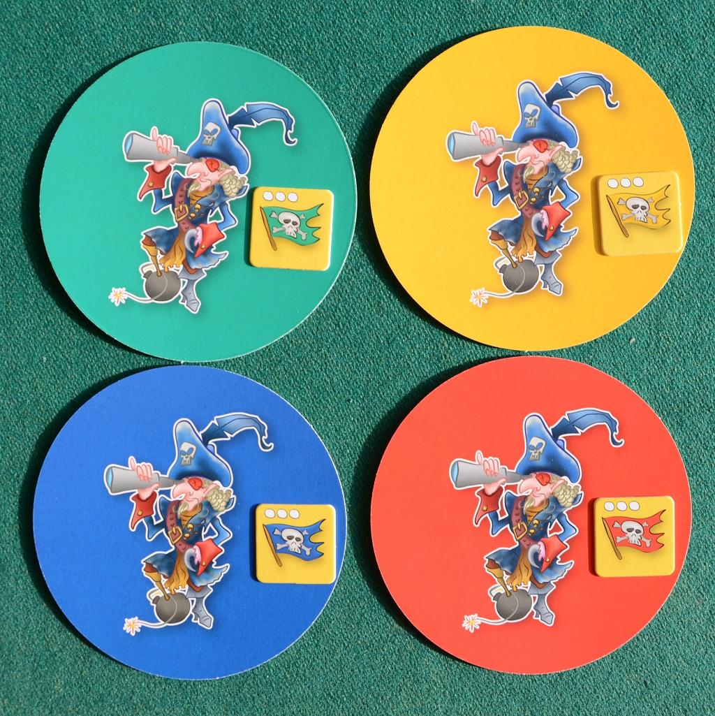 I giocatori iniziano la partita con un pirata (tessera da montare su una barca ed una basetta) attraccato al molo di partenza (l’isola di Tortuga?) e una bandiera dello stesso colore (che dovranno appendere al pennone più alto del vascello per proclamare la vittoria): inoltre prima di iniziare ricevono tre carte (due Missioni ed una Avventura).