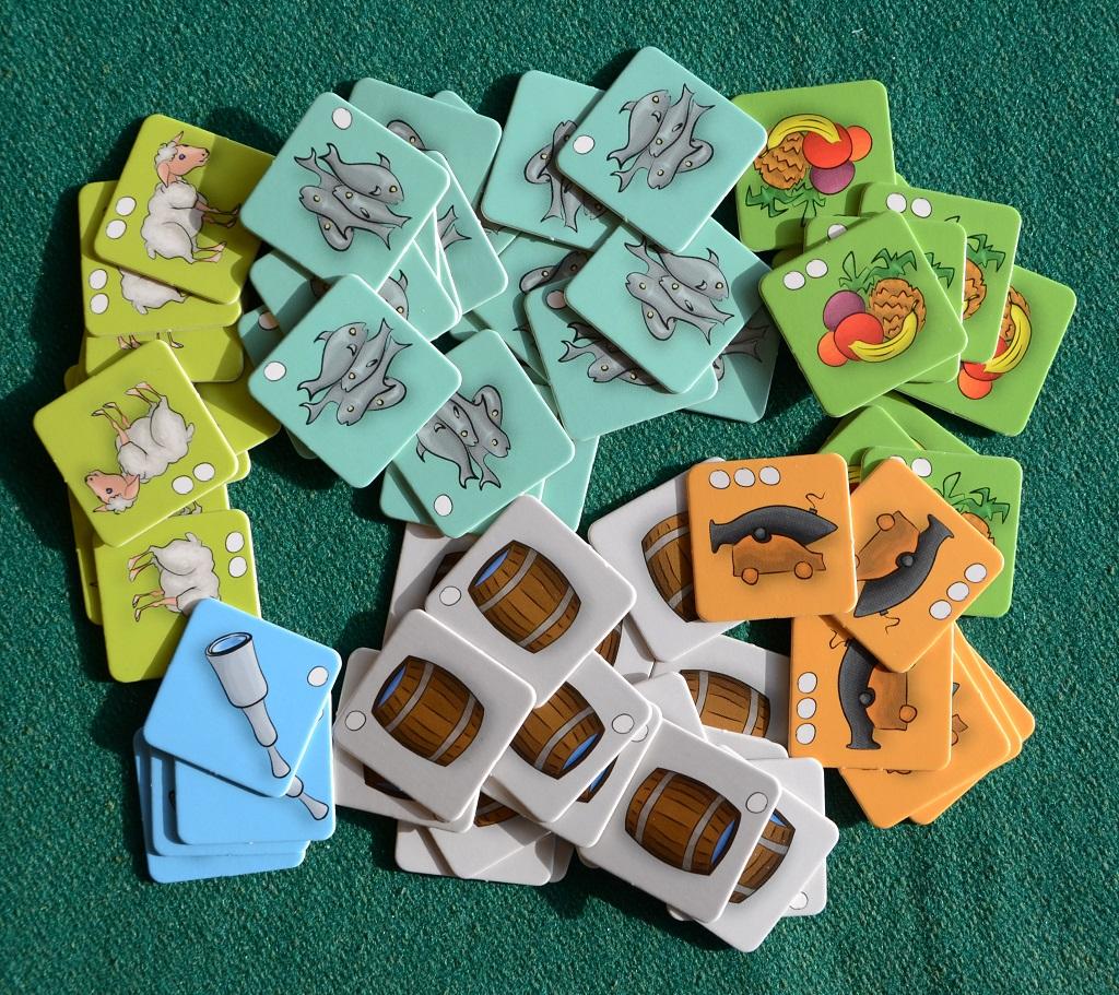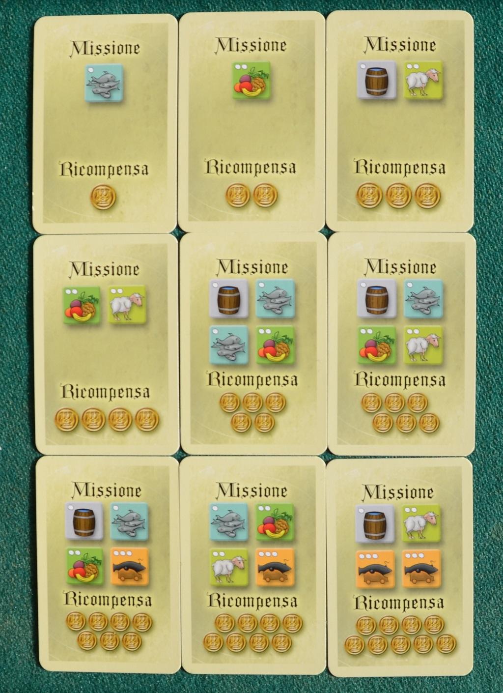 Le carte “Missione” indicano quante risorse dovranno essere raccolte dal pirata e riportate alla Tortuga per incassare il numero di dobloni indicato in basso; le carte “Avventura” invece contengono eventi che possono modificare il corso delle azioni: dobloni gratis, movimento degli Squali per attaccare gli avversari, attacco delle piovre, ecc.