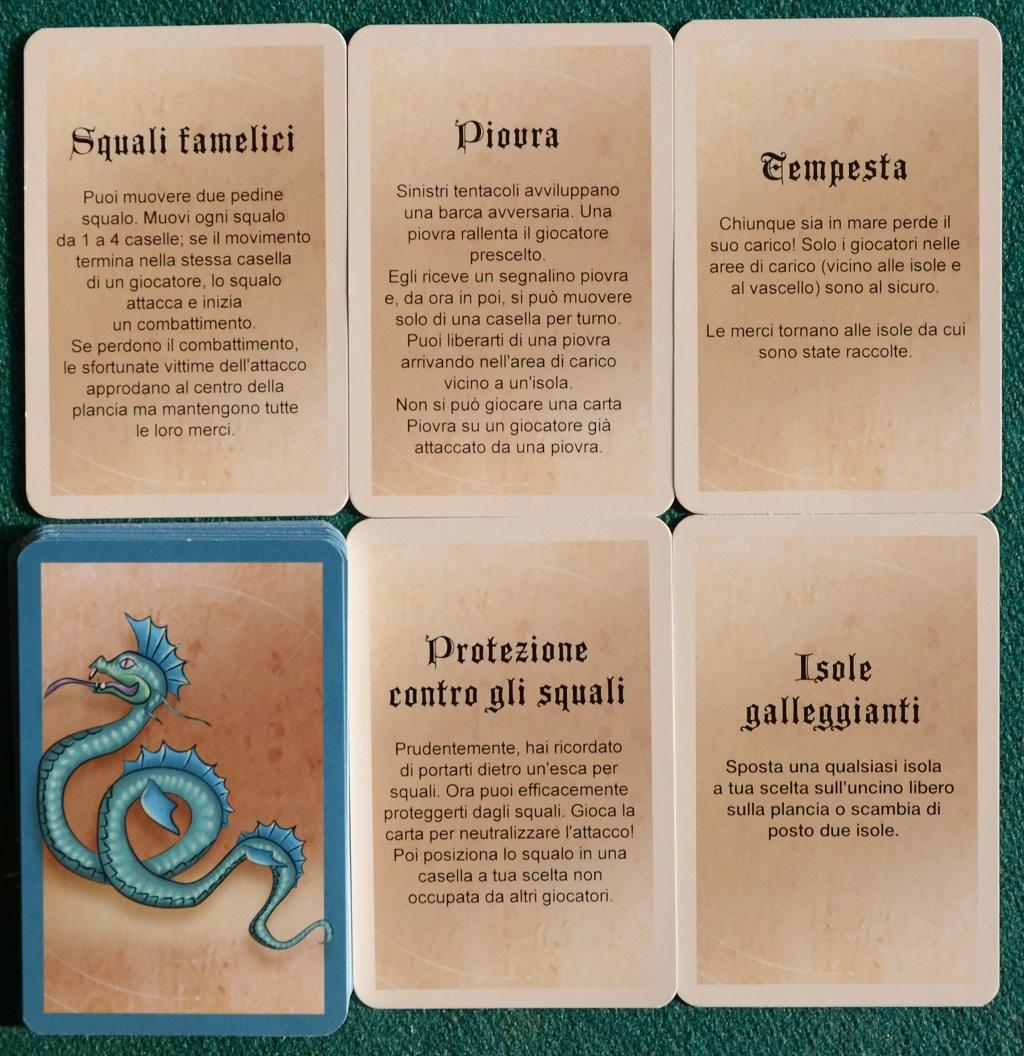 Le carte “Avventura” servono a variare il gioco (ed anche qui la fortuna ha la sua parte) soprattutto per ostacolare gli avversari, mandandogli contro gli Squali (combattimento in vista) e le piovre (che rallentano il movimento delle barche, limitandolo ad una casella per turno finché non arrivano su un’isola o alla Tortuga).