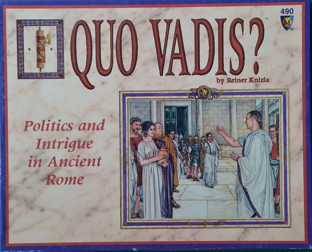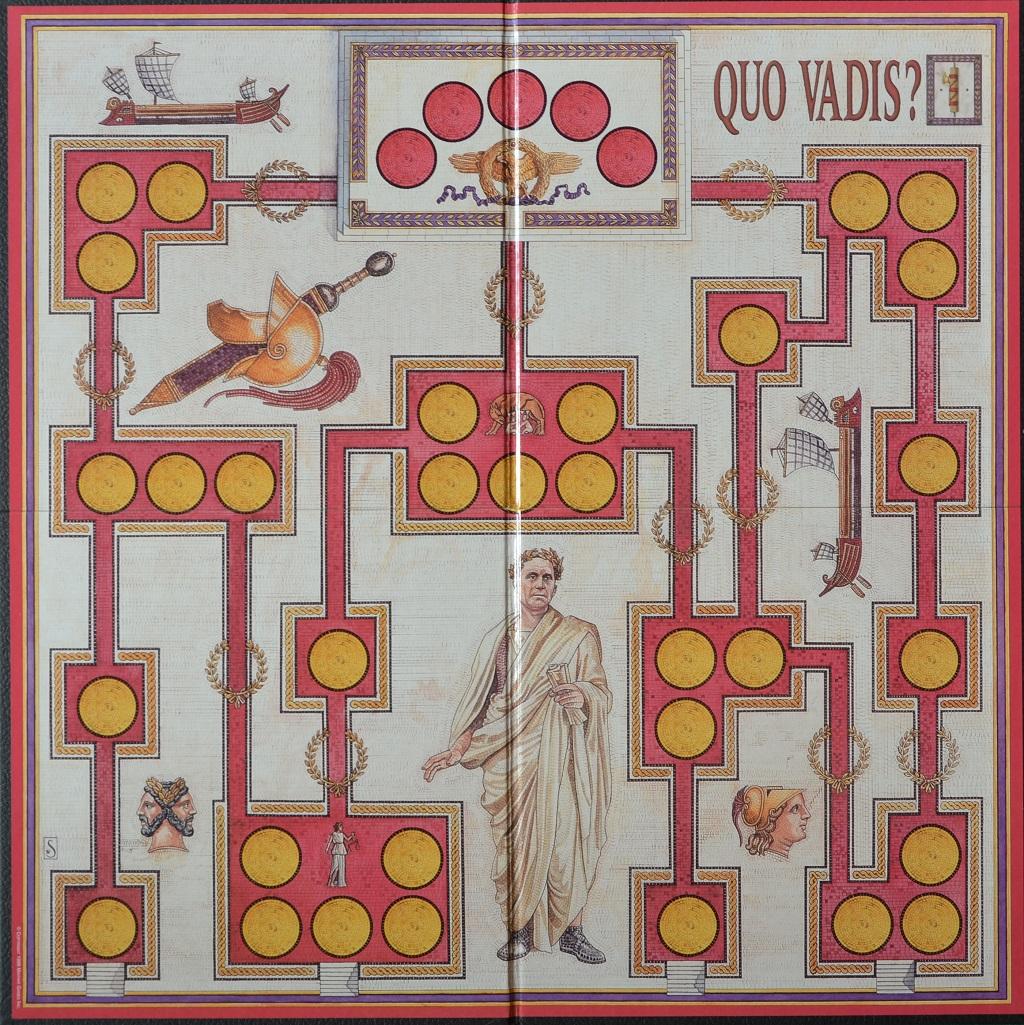 QUO VADIS è un gioco di Reiner Knizia, altamente interattivo, che trasporta i partecipanti al tempo dell’antica Roma e li mette nel ruolo di senatori alla caccia di una posizione di rilievo nel “Sanctum”. Il tabellone mostra alcuni percorsi all’interno del Senato romano con caselle da 1-3-5 posti e dei cerchietti sui corridoi di collegamento fra le stanze sui quali vengono messi causalmente dei gettoni di valore 2-5 Punti Vittoria (PV). I giocatori ricevono 8 segnalini “Senatore”.