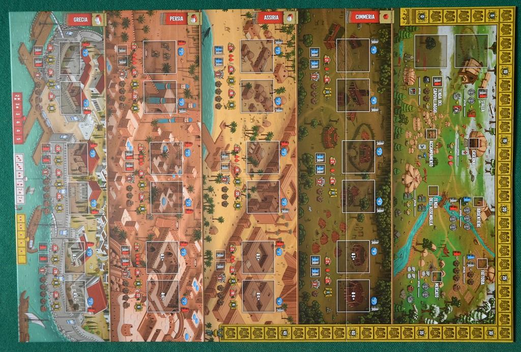 Il tabellone rappresenta la regione Sciita (in alto) e quelle vicine: Cimmeria, Assiria, Persia e Grecia. In Scizia ci posano due tessere “Missione” e 3 lavoratori blu in 3 delle 8 caselle “Azione”: su queste ultime sarà possibile posare il proprio lavoratore per ottenere risorse, carte, truppe ed effettuare Missioni per guadagnare Punti Vittoria (PV). Su ognuna delle altre regioni (Grecia esclusa) vengono invece posate 6 tessere Missione con 2-4 segnalini “bottino” (oro, legno, bestiame o carro) ciascuna.