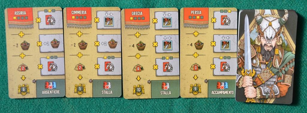 Come si vede il gioco è molto “lineare”: con le pedine blu cerco di fare azioni in Scizia e rafforzo il mio esercito per razziare la Cimmeria, dove acquisisco, oltre al bottino, i lavoratori grigi con cui posso rinforzare ancora di più il mio esercito (con gli animali) e posso razziare la Siria per avere i lavoratori rossi con cui attaccare Persia e Grecia, ma solo dopo aver costituito un forte esercito bene equipaggiato di provviste e carri.