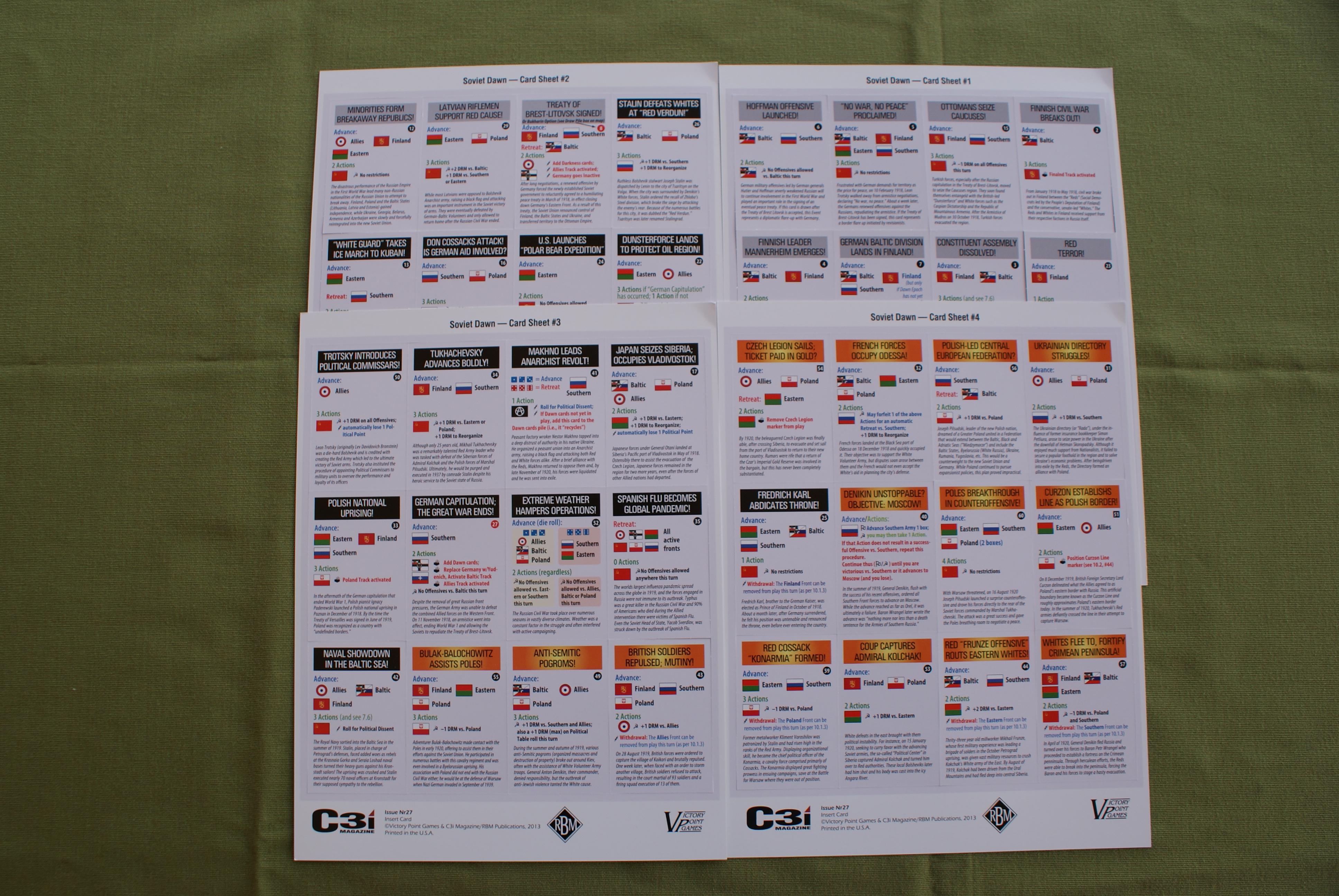 Eccoci a parlare di Soviet Dawn un gioco in solitario della Victory Point Games(VPG) che appartiene alla serie States of Siege e che si propone di ripercorrere tutta la Guerra Civile Russa. Questo conflitto è iniziato in pratica appena dopo la Rivoluzione d’Ottobre e si è concluso nel 1921 con la definitiva presa del potere dei bolscevichi: il giocatore dovrà rivestire proprio i panni degli alti comandi “rossi”. Come ricorderete ci siamo già occupati di giochi della serie SoS. Pur condividendo tutti lo stesso scheletro e la stessa filosofia, le differenze tra i diversi titoli possono essere sensibili. Per esempio con Dawn of the Zeds 2nd Edition (DotZ), la prima differenza lampante (e ovvia) è che quest’ultimo non ha un background storico a cui appoggiarsi (fortunatamente!). Come diretta conseguenza abbiamo che DotZ, per risultare più coinvolgente, ha avuto bisogno di carne al fuoco aggiuntiva. Nella pratica questo si è tradotto nell’aver immesso una maggior complessità e ricchezza nel gameplay, cosa che per questo titolo zombesco è stata fatta veramente molto bene.