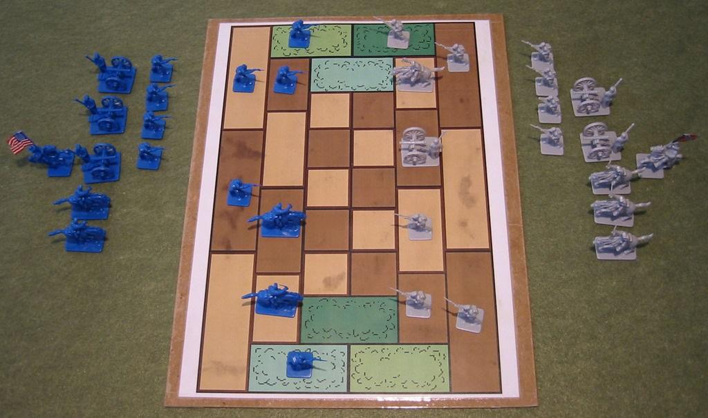 SQUARES: THE CIVIL WAR BATTLE GAME è un gioco astratto… camuffato da wargame: il tabellone è diviso in 32 caselle (quadrate e rettangolari), due delle quali sono le basi dei due eserciti ed altre sei sono di Foresta (tre per lato, in modo da creare una strettoia al centro). Ad inizio partita i due avversari schierano le loro miniature (9 fanti, 4 cavalieri e 3 cannoni) sulle rispettive basi, poi il gioco può iniziare.