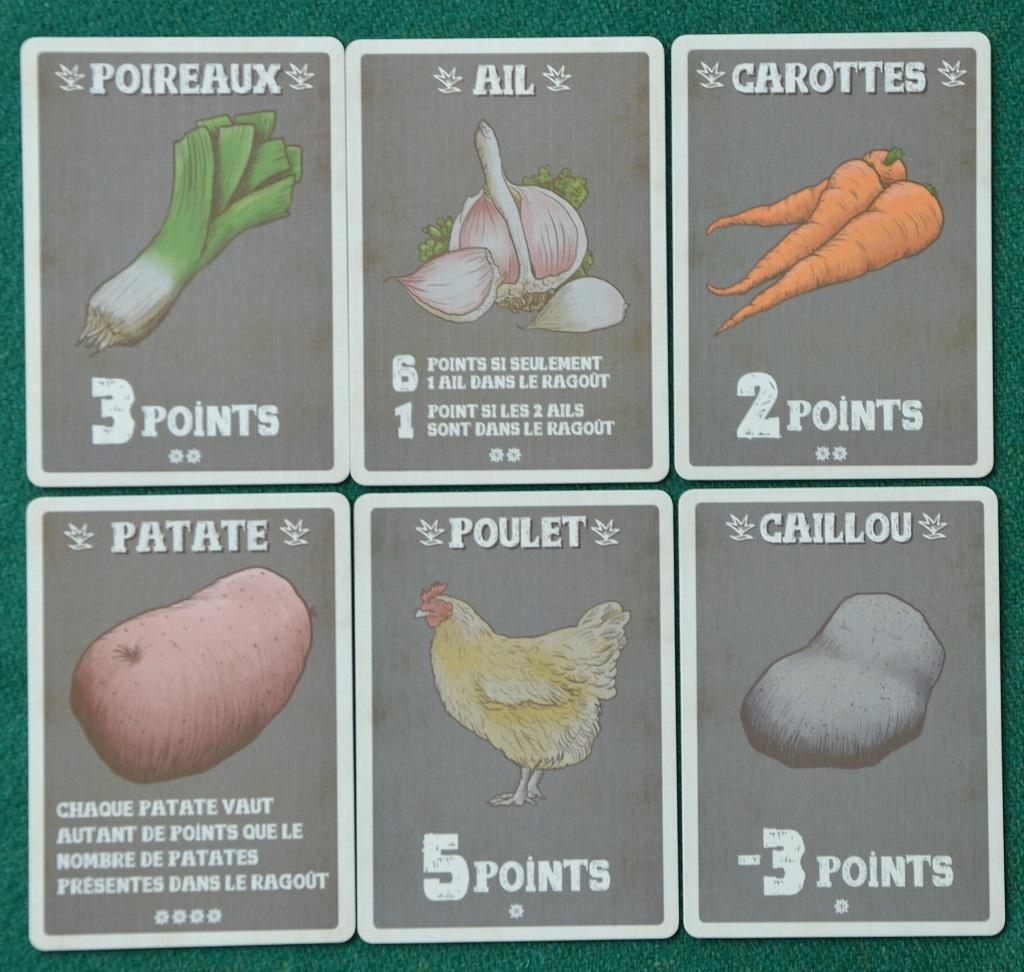 I giocatori devono preparare un ragù per il loro pranzo, usando 12 carte ingredienti: 4 patate (valore 1-4-9-16 punti a seconda del numero presente nel ragù), 2 carote (2 punti), 2 porri (3 punti), 2 agli (1 punto se da sola, 6 se ci sono entrambe), una gallina (5 punti) e un … sasso (-3 punti). Sulla tavola vengono messe anche 6 carte “affamato: 1 vagabondo (che vorrebbe mangiare del pollo), 1 cinghiale (che mangia l’aglio), 1 volpe (pollo), un orsetto lavatore (patata), 1 marmotta (porro) e 1 coniglio (carota… ovviamente).