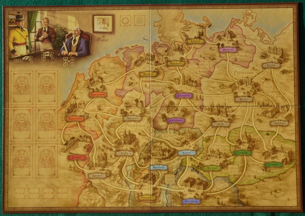 I giocatori devono cercare di raggiungere il maggior numero di città per crearvi i loro centri di smistamento e, per farlo, hanno a disposizione delle carte, ognuna delle quali mostra il nome di una città, il colore della regione ed un bellissimo disegno (con Menzel si va sempre sul sicuro!) che riproduce il monumento più significativo di quella località. Ogni città è riprodotta 3 volte.