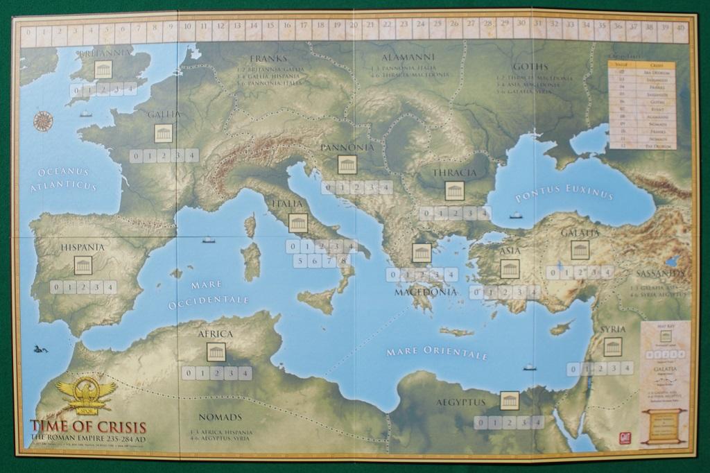 Time of Crisis: con il termine “Crisi del III° secolo” si vuole indicare il periodo storico (235-284 DC) durante il quale l’Impero Romano fu a lungo sull’orlo del collasso, sballottato fra invasioni barbariche e lotte interne che arrivarono fino alla secessione (come la nascita del Regno di Palmira e la creazione dell’Impero delle Gallie). Gli storici tendono a dare la colpa di questa crisi al fatto che, dopo tanti secoli, Roma non riusciva più ad espandersi ma era anzi costretta a difendersi sempre più tenacemente: le imponenti mura Adriane costruite attorno alla città eterna ed ancor oggi ben visibili, rendono tangibili le “paure” dell’epoca anche agli uomini del ventunesimo secolo. L’economia romana era sempre stata basata sul binomio “politica” ed “esercito”: le Legioni conquistavano il mondo e le popolazioni vinte provvedevano a pagare i tributi. Non avendo più spinte espansionistiche l’esercito diventò addirittura un “peso” per l’economia di Roma: era formato da 500.000 soldati professionisti a fronte di una popolazione di poco più di 50 milioni di abitanti (in tutto l’Impero). Le legioni, essendo ormai composte da tante etnie diverse, diventarono anche una costante minaccia per l’Imperatore stesso. Solo con la vittoria di Claudio contro i Goti e la riconquista di Palmira e della Gallia da parte di Aureliano l’Impero riprese forza anche se da allora il Senato fu escluso definitivamente dal comando militare, passato ormai ai Praefecti Equiti.