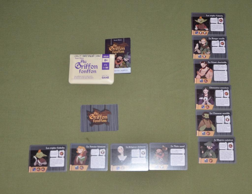 UGLY GRYPHON INN (“Griffon Fonffon” per l’edizione francese) è un gioco di carte davvero “ridotto all’osso” e fa parte di una serie chiamata “Micro Game” che la casa editrice francese Matagot ha creato per diffondere giochi “intelligenti” ad un costo davvero molto basso e quindi accessibile a tutti. Si tratta di un gioco “In solitario” ed è composto semplicemente da 18 carte “Cliente” e da un minuscolo pieghevole con le regole.