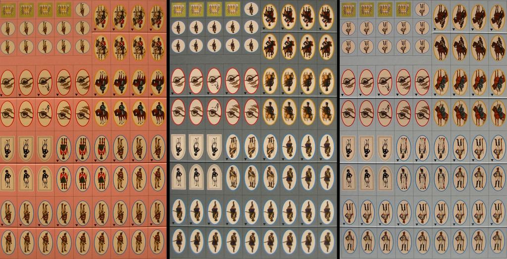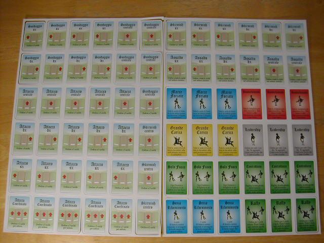 Per poter lanciare all’attacco le nostre truppe dobbiamo prima impartire loro degli ordini: a questo scopo si usano 72 carte, divise in 48 “ordini” e 24 “speciali”. Prima di iniziare la battaglia si creano due mazzetti di 36 carte (12 speciali e 24 normali) dai quali i giocatori estrarranno le prime 6 per iniziare lo scontro.