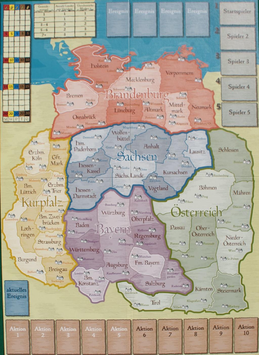 Il tabellone ci mostra la zona dell'Europa centro settentrionale che fu il centro della Guerra dei 30 anni, diviso in cinque grandi regioni, ognuna delle quali contiene un certo numero di province e di città.