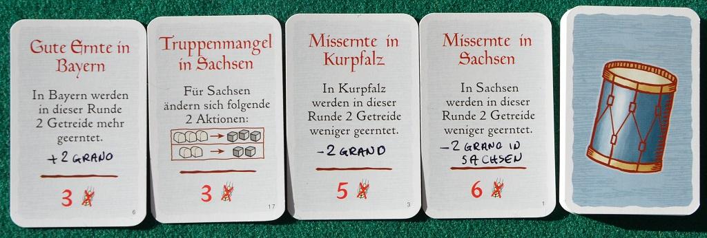 Ad inizio anno si estraggono a sorte 4 carte "Evento" (che modificano leggermente le condizioni sul terreno, dando più o meno risorse, impedendo gli scontri in certe città, ecc.) e all'inizio di ogni stagione se ne prende una, sempre a caso, che resta attiva per quel turno.