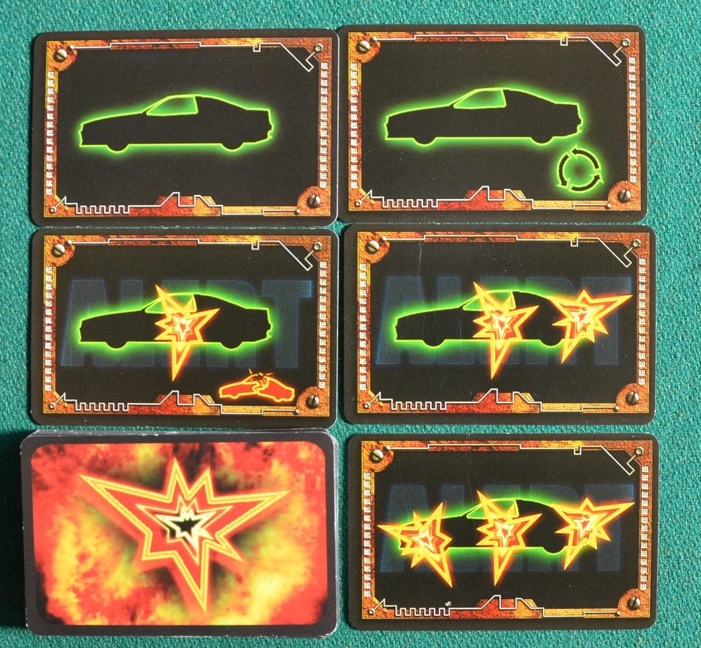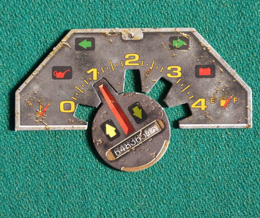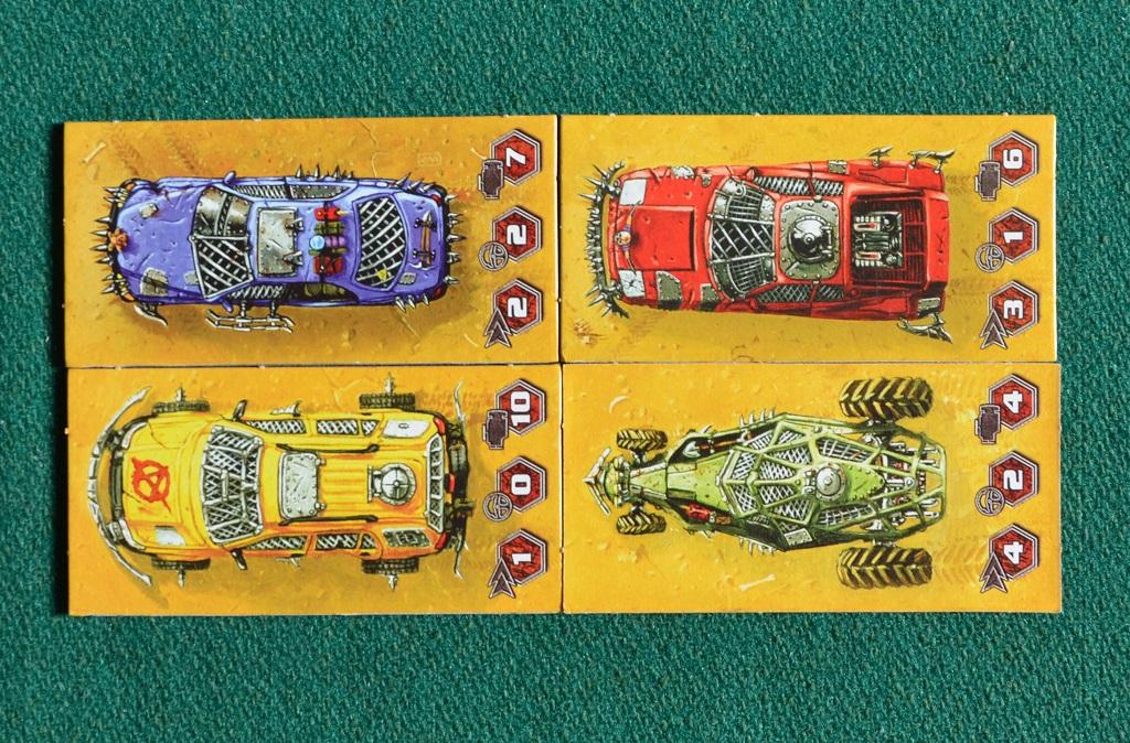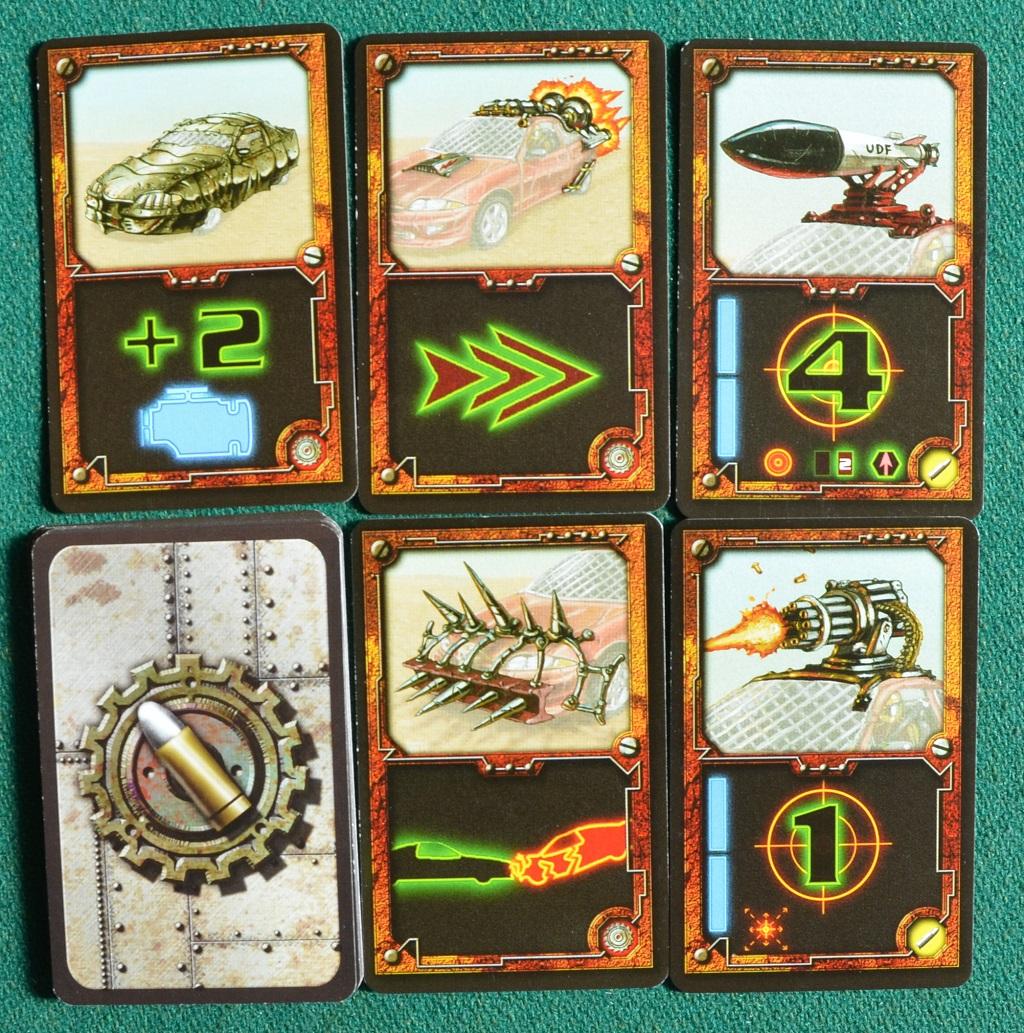 Ogni veicolo è caratterizzato da TRE valori di base (Accelerazione, Manovrabilità e Resistenza) e può essere migliorato con qualche accessorio … fuori serie (mitragliatrici, lanciarazzi, lanciafiamme, laser, corazzature, mine, ecc.) da scegliere fra le carte EQUIPAGGIAMENTO in dotazione: ogni accessorio ha un valore di attacco e un raggio di azione (Corto o Lungo).