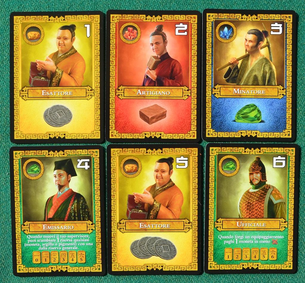 Le carte mostrano una o più risorse (o monete) nella parte bassa, un disegno al centro, per caratterizzarle, un colore in alto a sinistra ed un numero in alto a destra. Ogni coppia di carte viene giocata sovrapposta: la carta sul davanti è quella da usare, mentre di quella sul retro si guarda solo il numero per determinare l'ordine del turno (la più alta gioca per prima ed in caso di pareggio si guardano dei segnalini su un'apposita pista "mausoleo": il più avanti, o il più alto di una pila, ha la precedenza).